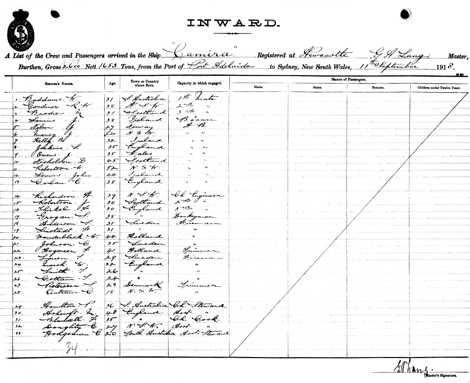 CAMIRAOF NEWCASTLE, G. A. LANG, MASTER, BURTHEN 2600/1653 TONS FROM THE PORT OF PORT ADELAIDE TO SYDNEY, NEW SOUTH WALES, 11 SEPTEMBER, 1918 |