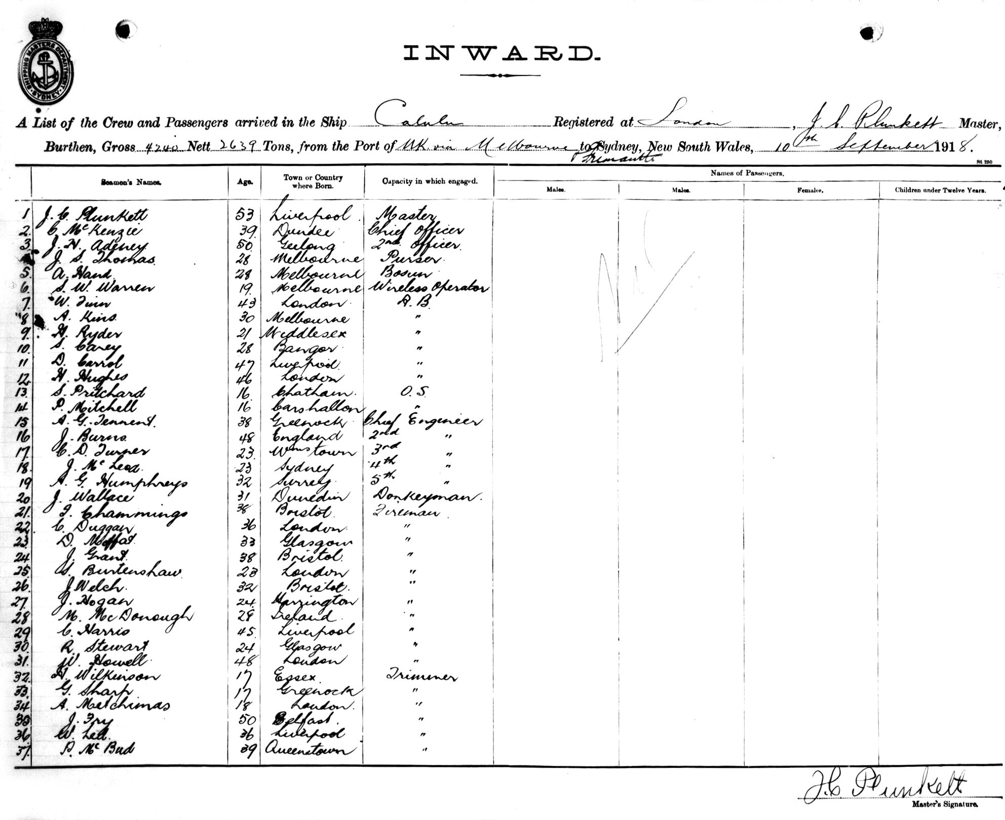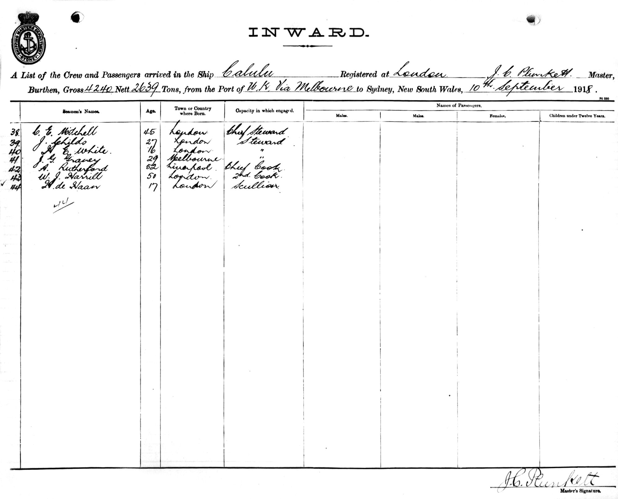 CALULUOF LONDON, J. C. PLUNKETT, MASTER, BURTHEN 4240/2639 TONS FROM THE PORTS OF U.K. via FREMANTLE & MELBOURNE TO SYDNEY, NEW SOUTH WALES, 10TH SEPTEMBER, 1918 |