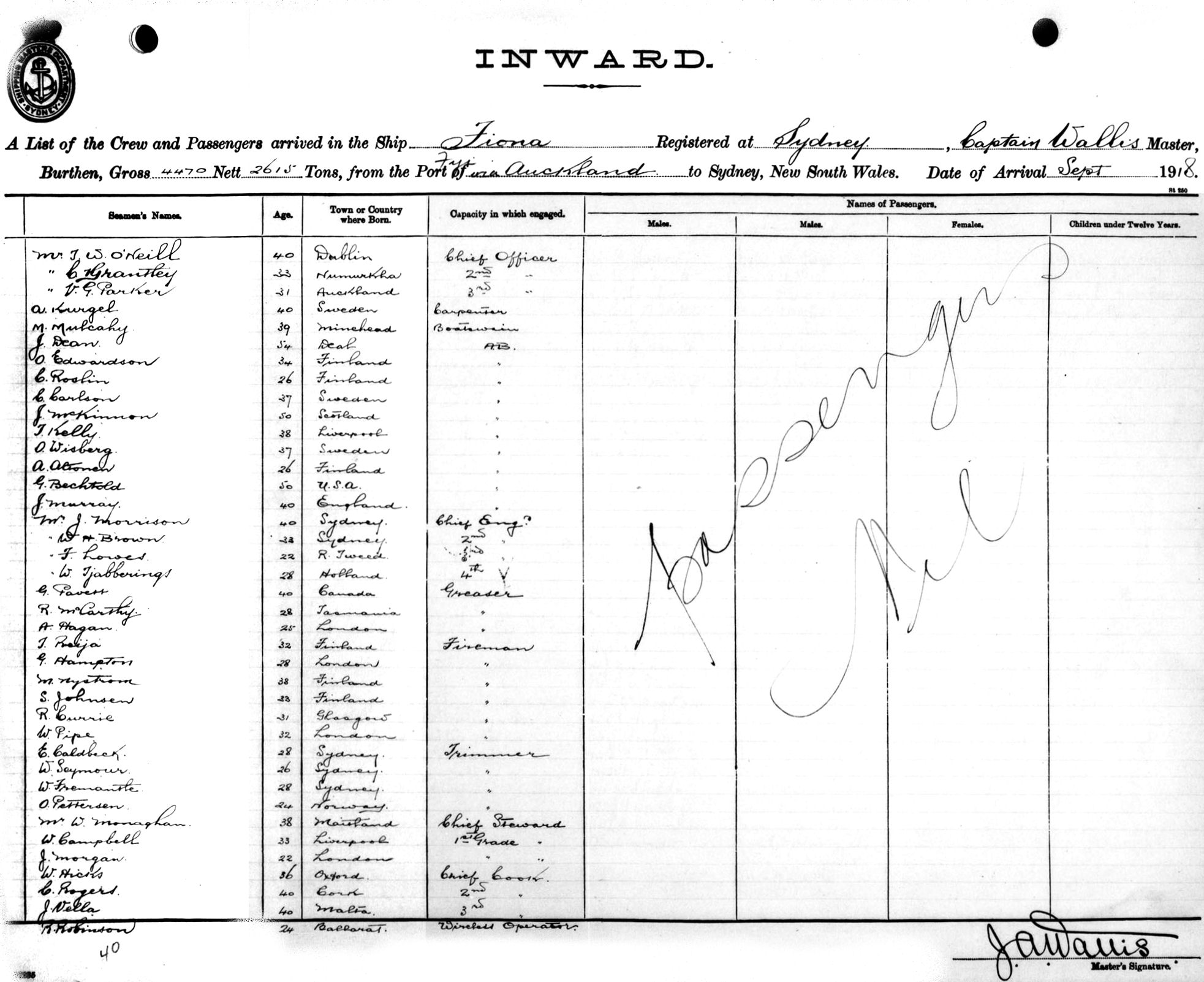 FIONAOF SYDNEY, J. A. WALLIS, MASTER, BURTHEN 4470/2615 TONS FROM THE PORT OF FIJI via AUCKLAND TO SYDNEY, NEW SOUTH WALES, (12TH) SEPTEMBER 1918 |