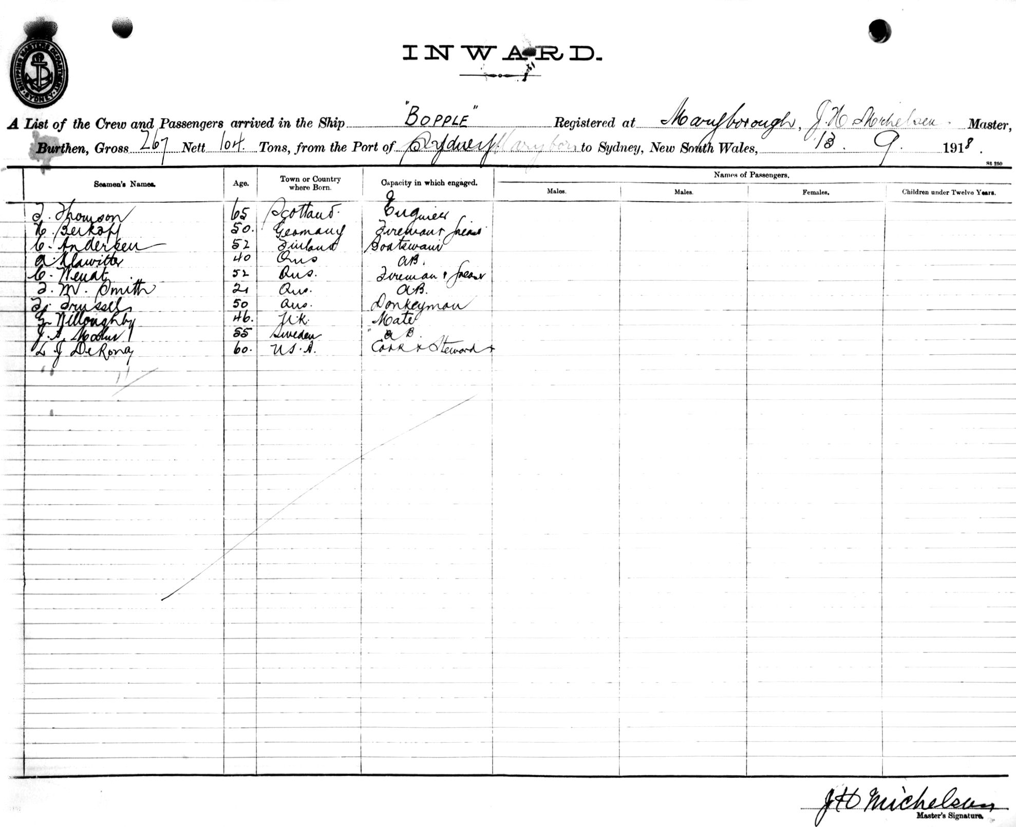 BOPPLEOF MARYBOROUGH, J. H. MICHELSON, MASTER, BURTHEN 267/104 TONS FROM THE PORT OF MARYBOROUGH TO SYDNEY, NEW SOUTH WALES, 13TH SEPTEMBER 1918 |