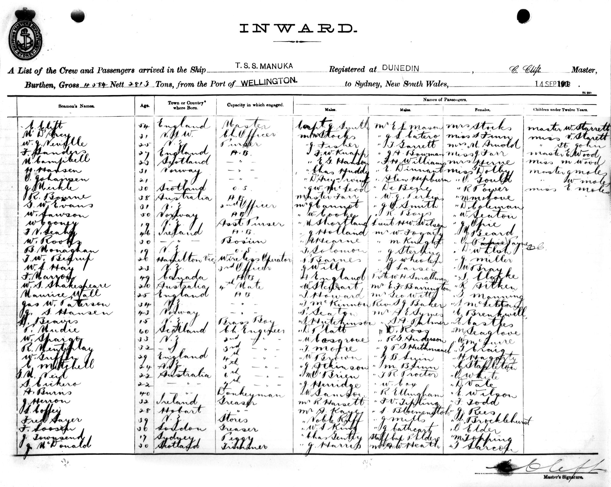 MANUKAOF DUNEDIN, C. CLIFT, MASTER, BURTHEN 4584/2813 TONS FROM THE PORT OF WELLINGTON TO SYDNEY, NEW SOUTH WALES, 14 SEPTEMBER, 1918 |