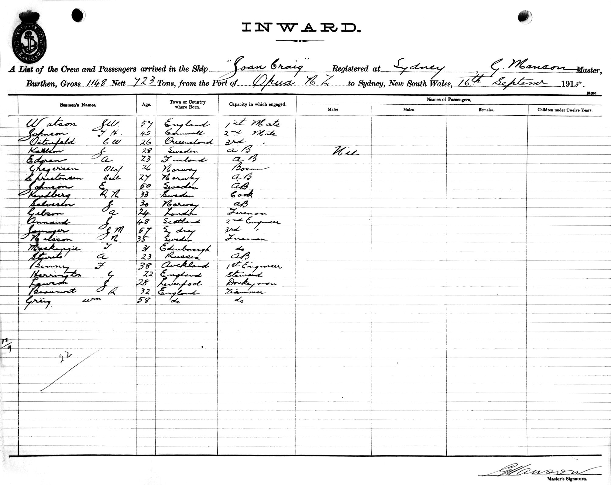 JOAN CRAIGOF SYDNEY, G. MANSON, MASTER, BURTHEN 1148/723 TONS FROM THE PORT OF OPUA, N.Z., TO SYDNEY, NEW SOUTH WALES, 16 SEPTEMBER, 1918 |