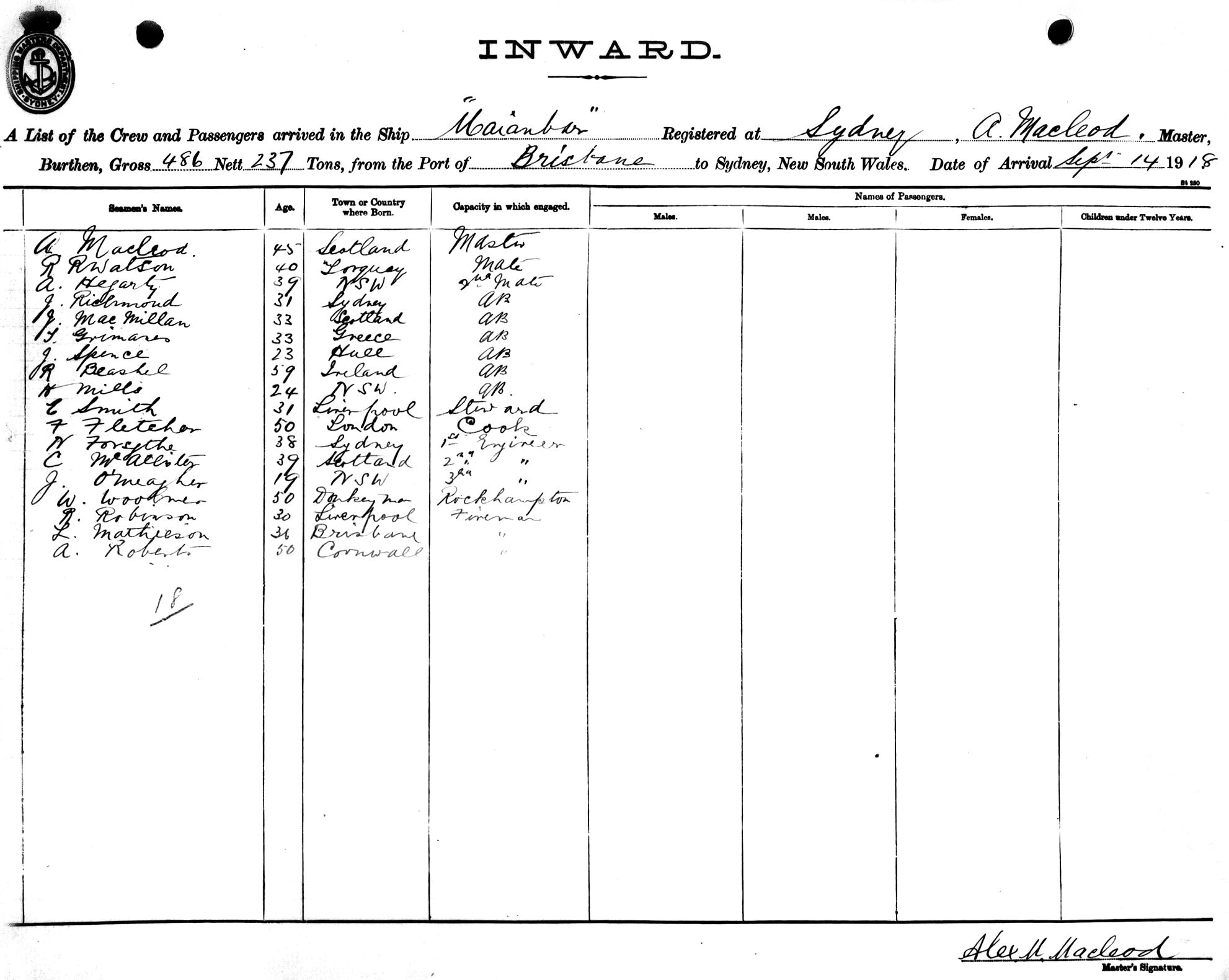 MAIANBAROF SYDNEY, A. MACLEOD, MASTER, BURTHEN 486/237 TONS FROM THE PORT OF BRISBANE TO SYDNEY, NEW SOUTH WALES, 14 SEPTEMBER, 1918 |