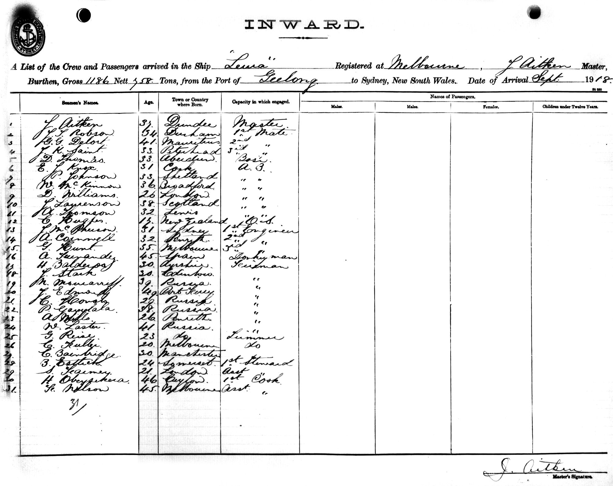 LEURAOF MELBOURNE, J. AITKEN, MASTER, BURTHEN 1186/758 TONS FROM THE PORT OF GEELONG TO SYDNEY, NEW SOUTH WALES, (16TH) SEPTEMBER, 1918 |