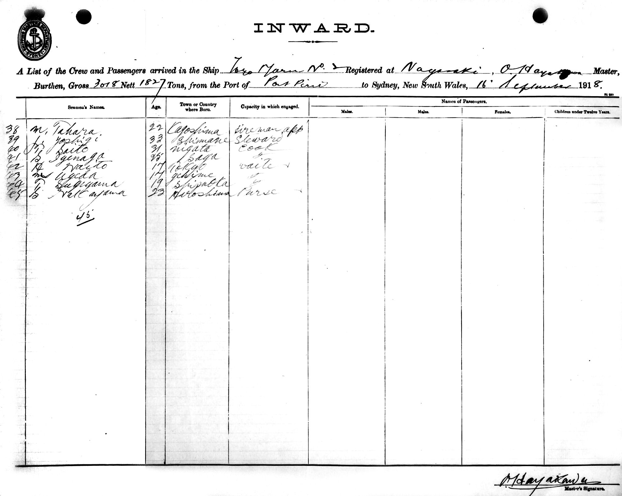 TOYO MARU IIOF NAGASAKI, O. HAYAKAWA, MASTER, BURTHEN 3018/1827 TONS FROM THE PORT OF PORT PIRIE TO SYDNEY, NEW SOUTH WALES, 16TH SEPTEMBER, 1918 |