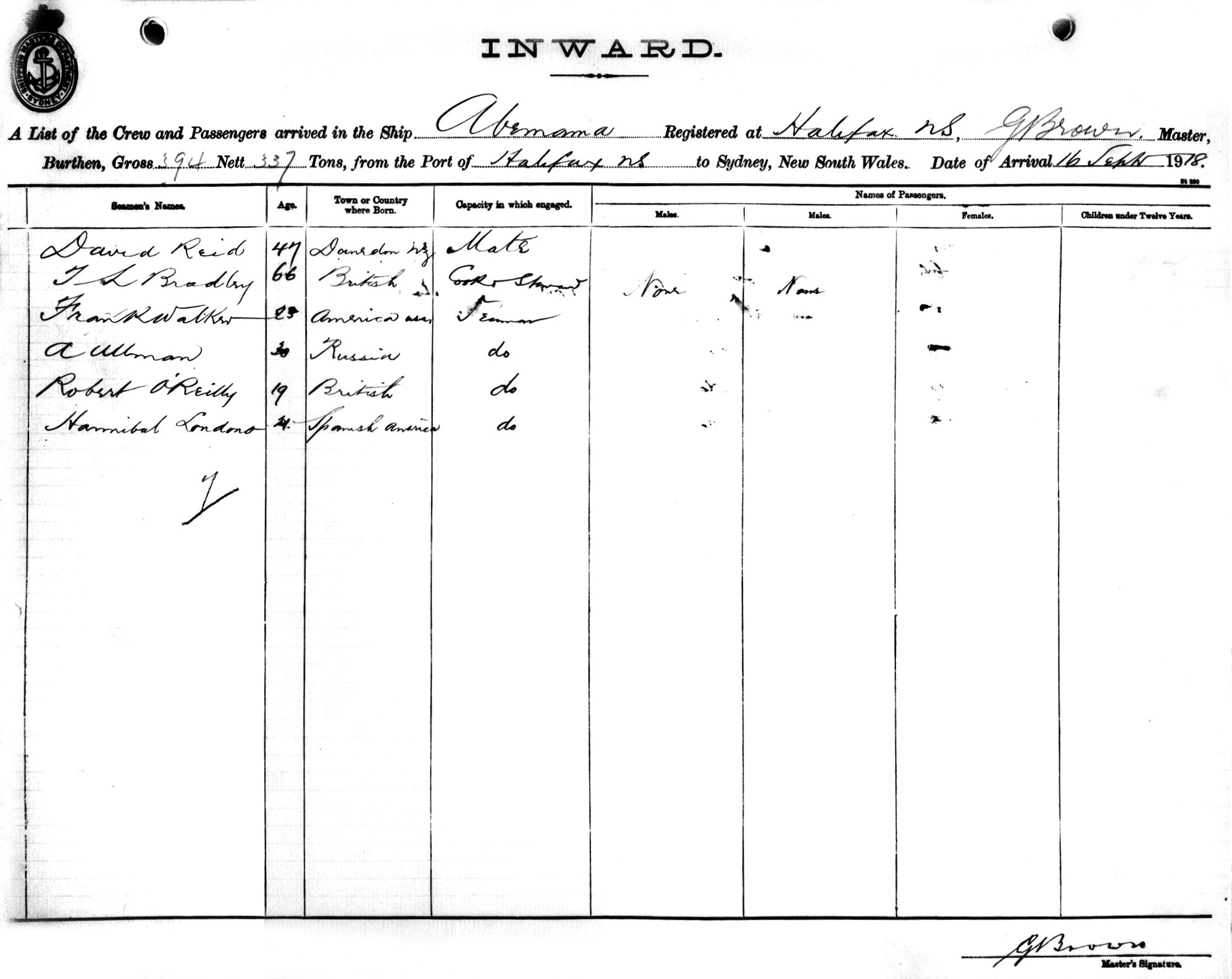 Mariners and ships in Australian Waters | ABEMAMAOF HALIFAX, N.S., G. BROWN, MASTER, BURTHEN 394/337 TONS FROM THE OF HALIFAX, N.S. TO SYDNEY, NEW SOUTH WALES, 16TH SEPTEMBER, 1918 |