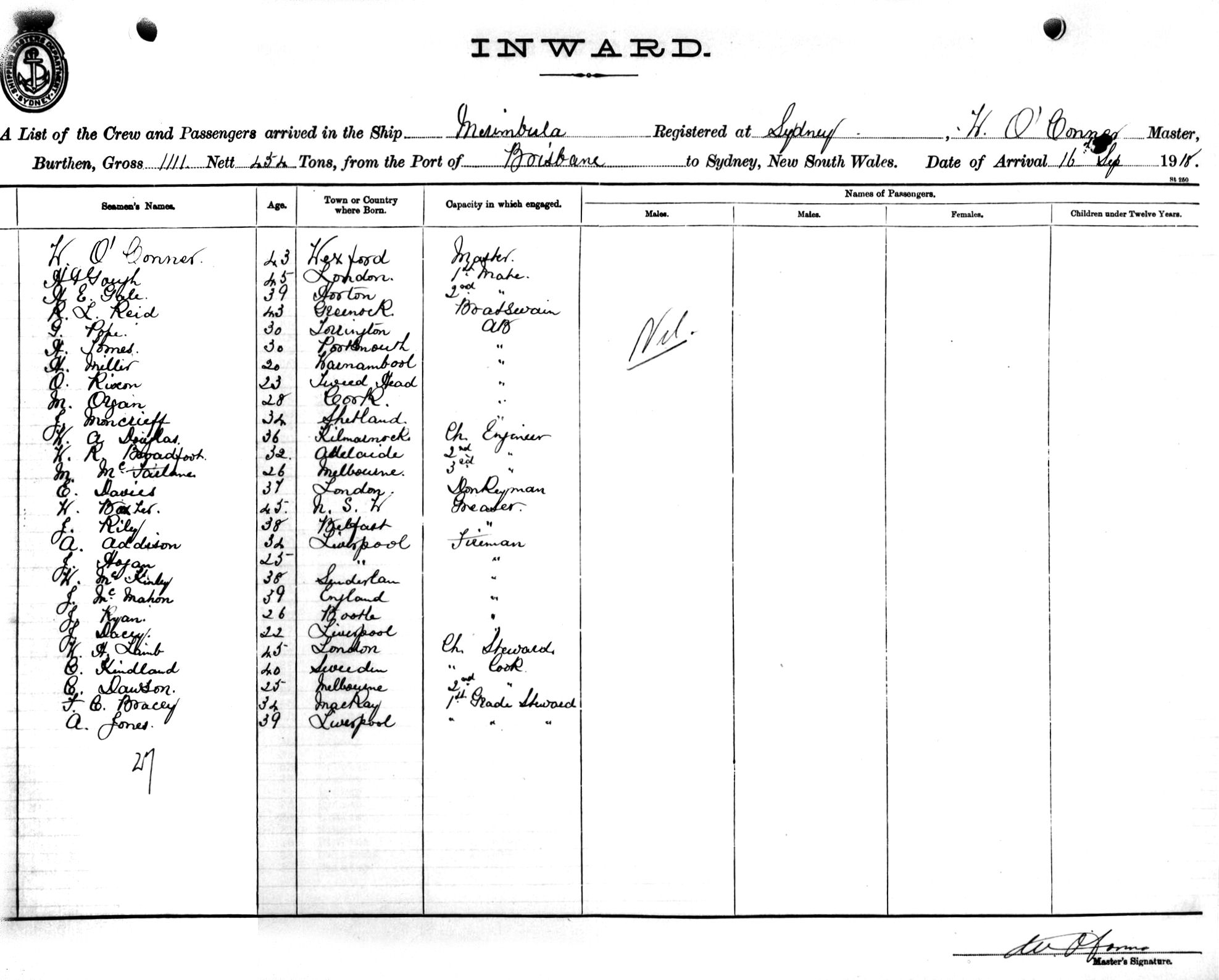 MERIMBULAOF SYDNEY, W. O'CONNER, MASTER, BURTHEN 1111/454 TONS FROM THE PORT OF BRISBANE TO SYDNEY, NEW SOUTH WALES, 16TH SEPTEMBER, 1918 |