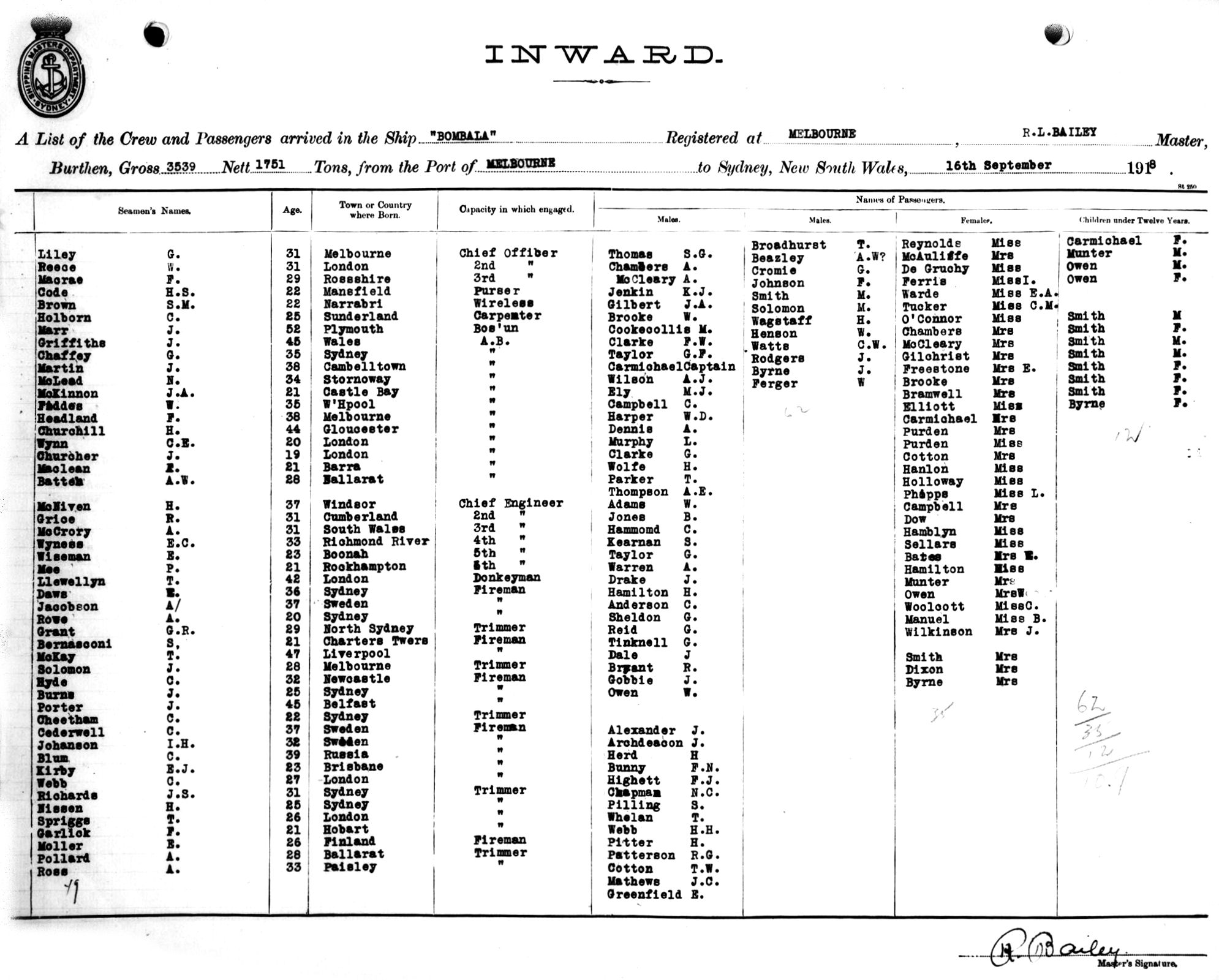 Mariners and ships in Australian Waters | BOMBALAOF MELBOURNE, R.L. BAILEY, MASTER, BURTHEN 3539 /1751 TONS FROM THE PORT OF MELBOURNE TO SYDNEY, NEW SOUTH WALES, 16TH SEPTEMBER, 1918 |
