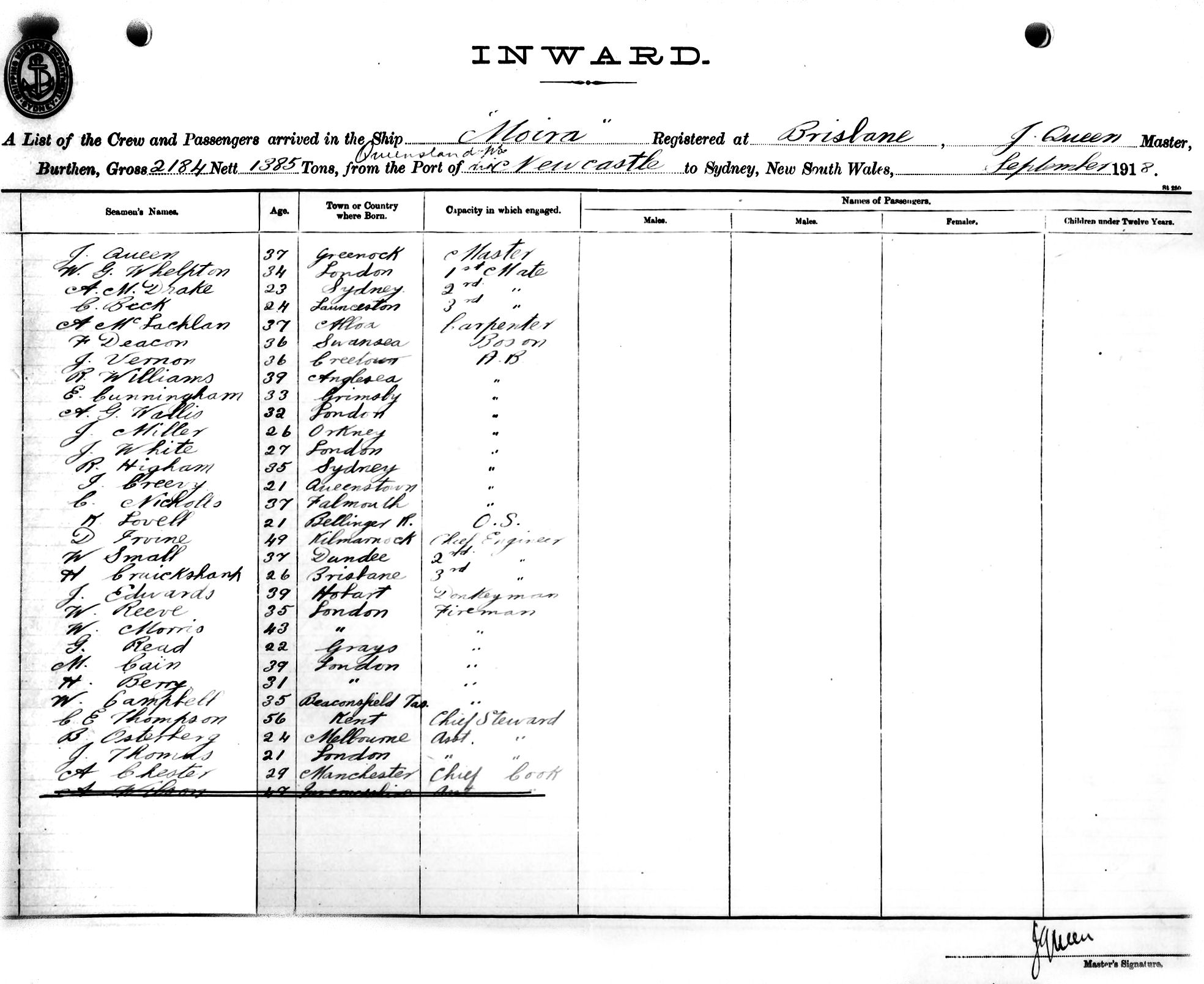 MOIRAOF BRISBANE, J. QUEEN, MASTER, BURTHEN 2184/1385 TONS FROM QUEENSLAND PORTS VIA NEWCASTLE TO SYDNEY, NEW SOUTH WALES, (17TH) SEPTEMBER, 1918 |