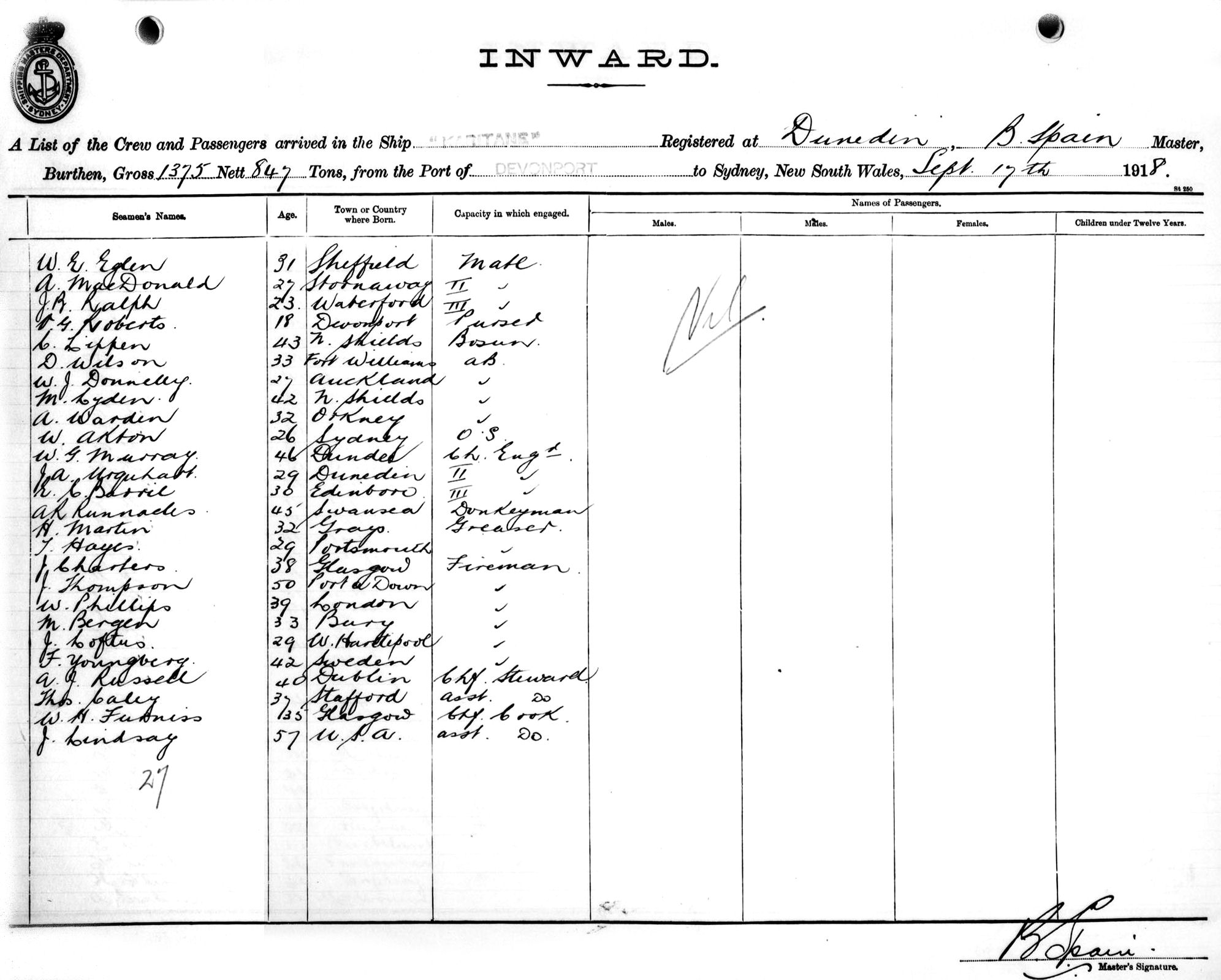KARITANEOF DUNEDIN, B. SPAIN, MASTER, BURTHEN 1375/847 TONS FROM THE PORT OF DEVONPORT TO SYDNEY, NEW SOUTH WALES, 17TH SEPTEMBER, 1918 |