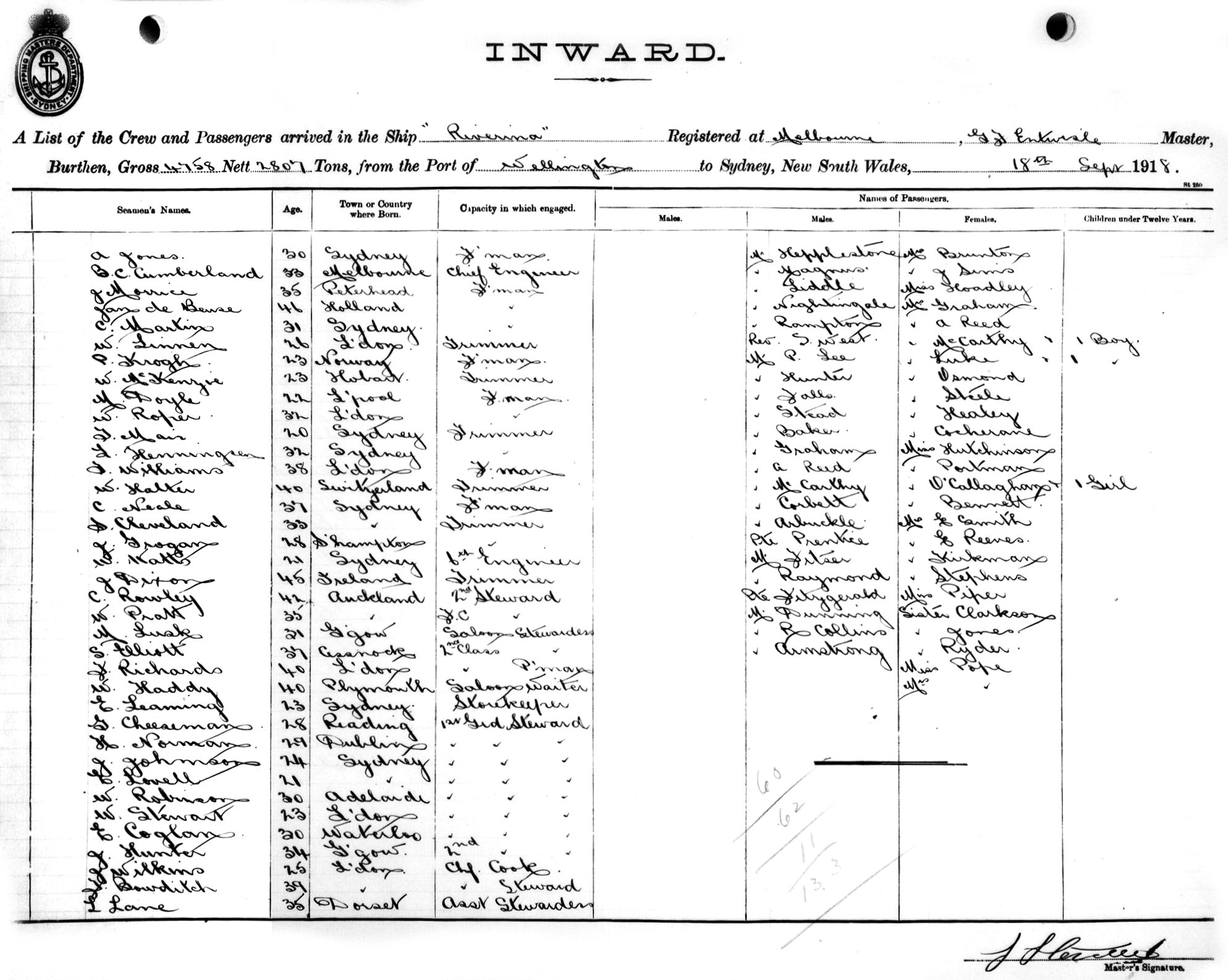 Mariners and ships in Australian Waters | RIVERINAOF MELBOURNE, G. F. ENTWISLE, MASTER, BURTHEN 4758/2807 TONS FROM THE PORT OF WELLINGTON TO SYDNEY, NEW SOUTH WALES, 18TH SEPTEMBER, 1918 |