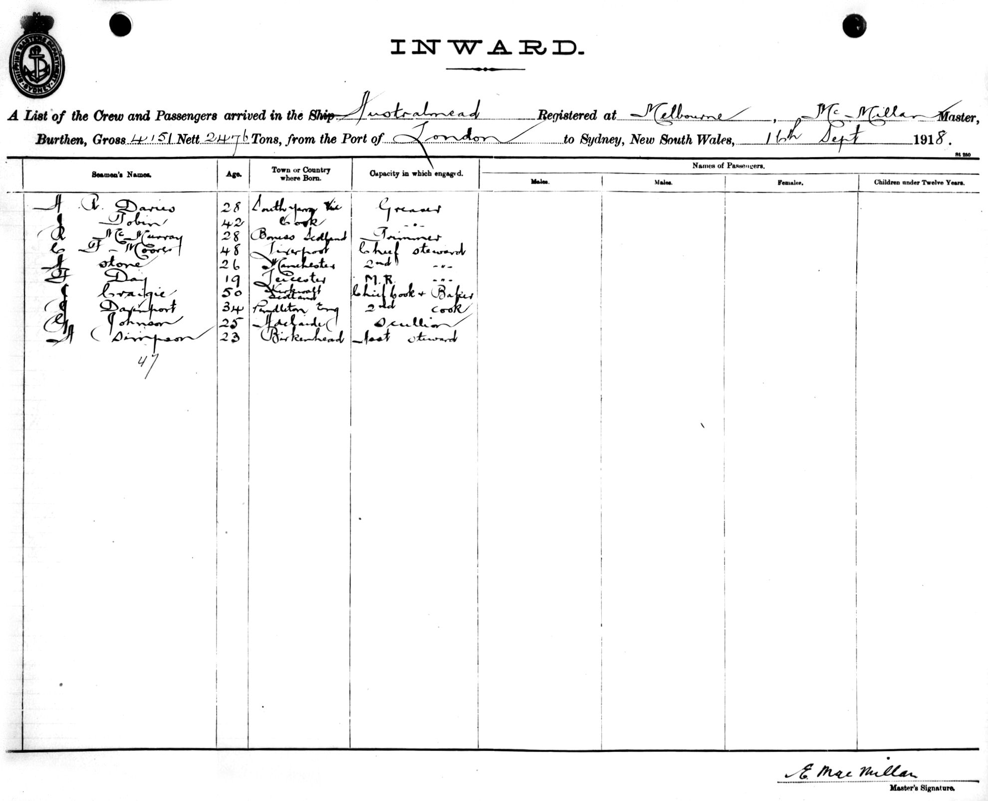 Mariners and ships in Australian Waters | AUSTRALMEADOF MELBOURNE, E. MACMILLAN, MASTER, BURTHEN 4021/2476 TONS FROM THE PORT OF LONDON TO SYDNEY, NEW SOUTH WALES, 16TH SEPTEMBER, 1918 |