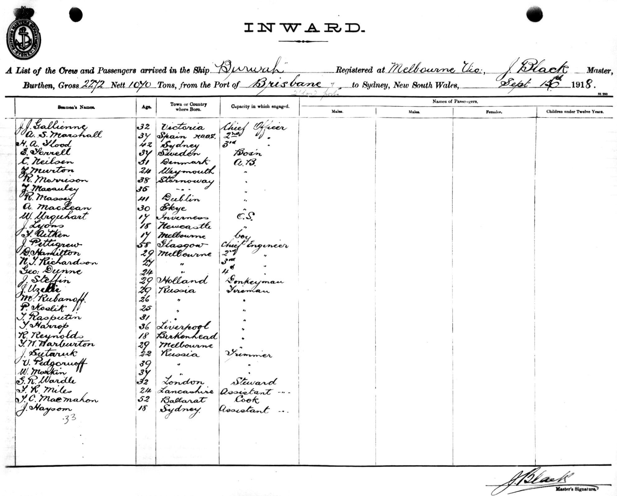 BURWAHOF MELBOURNE, J. BLACK, MASTER, BURTHEN 2272/1070 TONS FROM THE PORT OF BRISBANE & QUEENSLAND PORTS TO SYDNEY, NEW SOUTH WALES, 16TH SEPTEMBER 1918 |