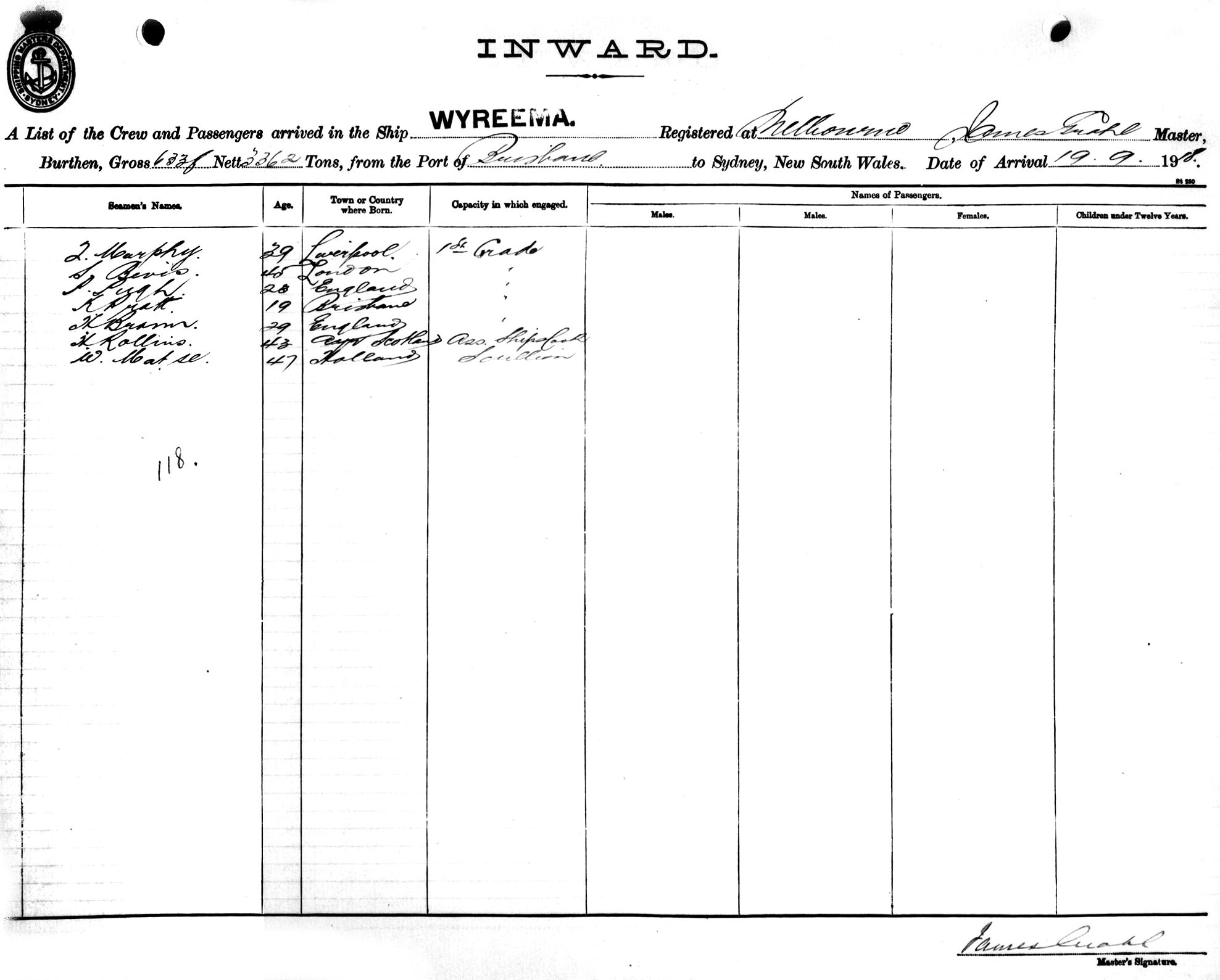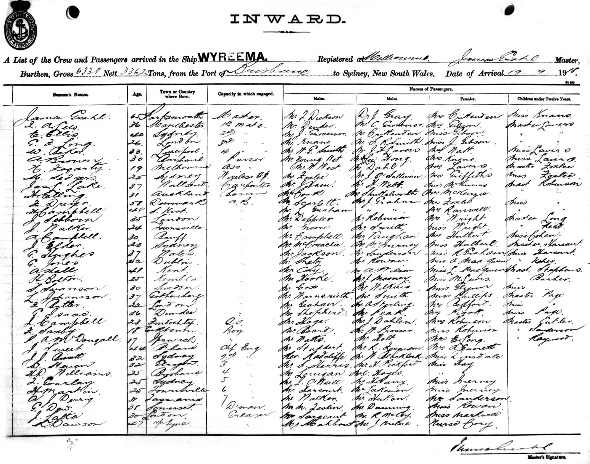 Mariners and ships in Australian Waters | WYREEMAOF MELBOURNE, JAMES GRAHL, MASTER, BURTHEN 6338/3362 TONS FROM THE PORT OF BRISBANE TO SYDNEY, NEW SOUTH WALES, 19TH SEPTEMBER 1918 |