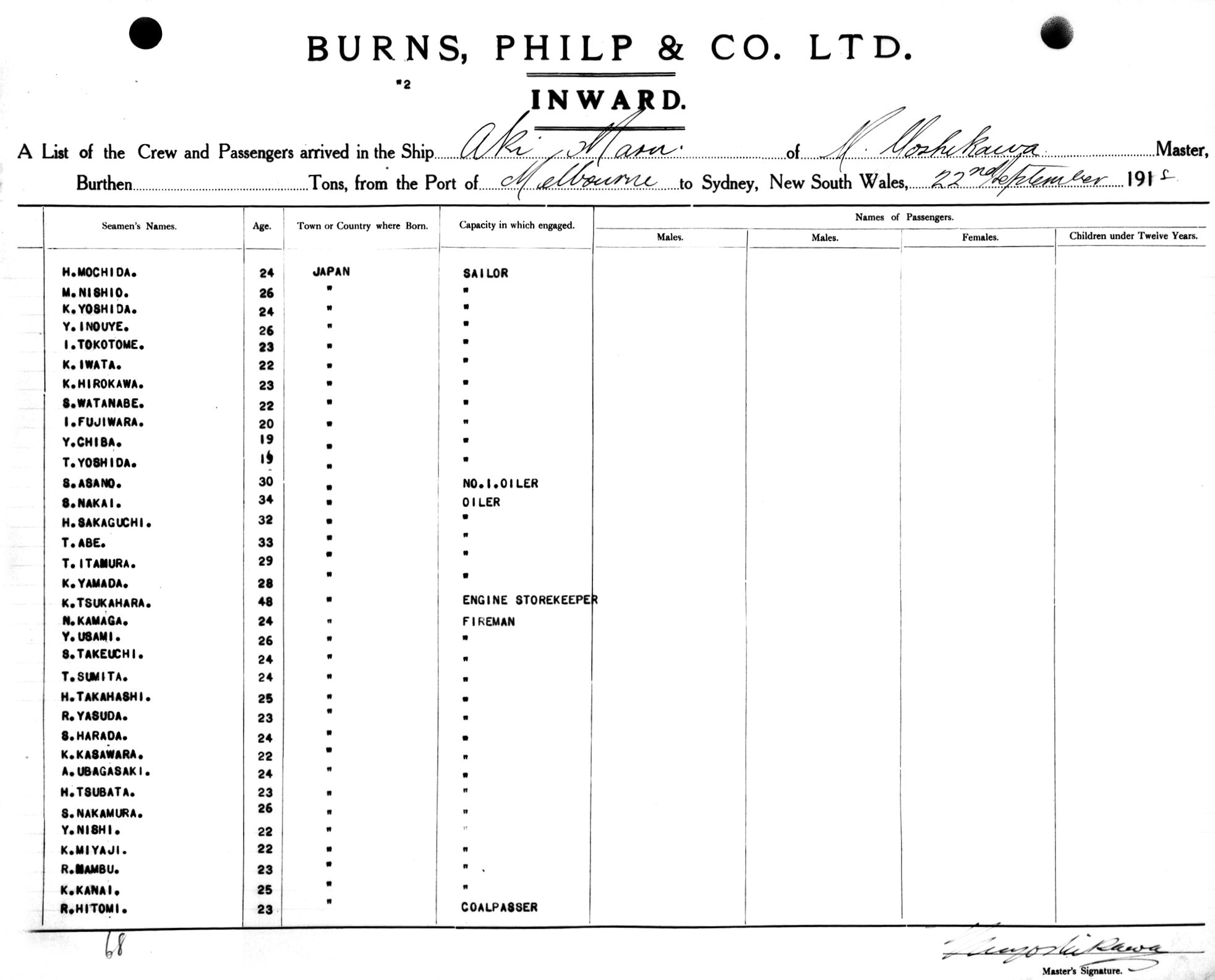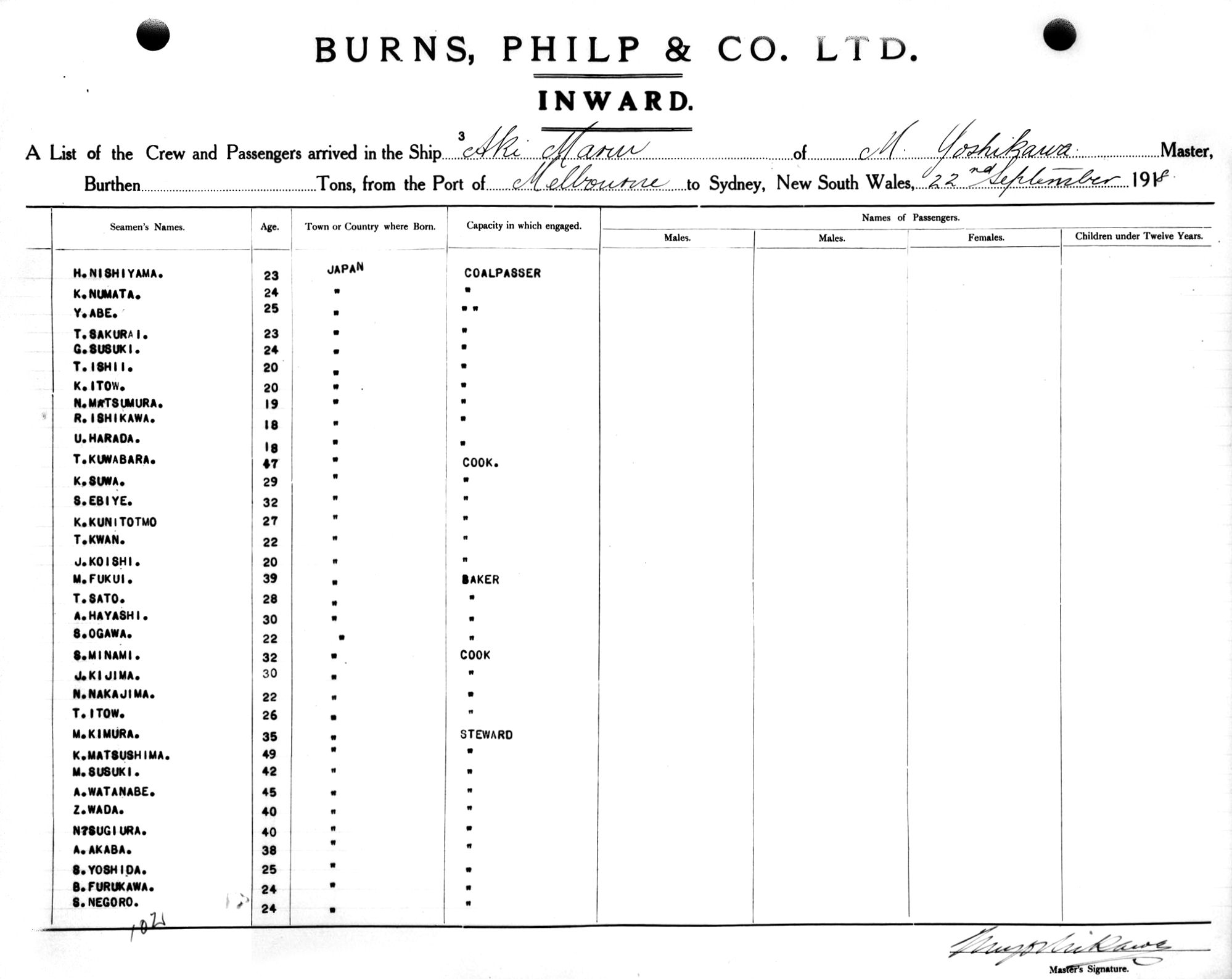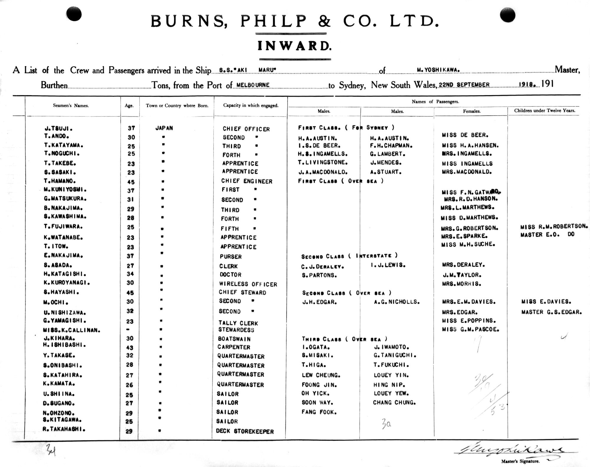 AKI MARUOF JAPAN, M. YOSHIKAWA, MASTER, BURTHEN 6009/3676 TONS FROM THE PORT OF MELBOURNE TO SYDNEY, NEW SOUTH WALES, 22ND SEPTEMBER, 1918 |