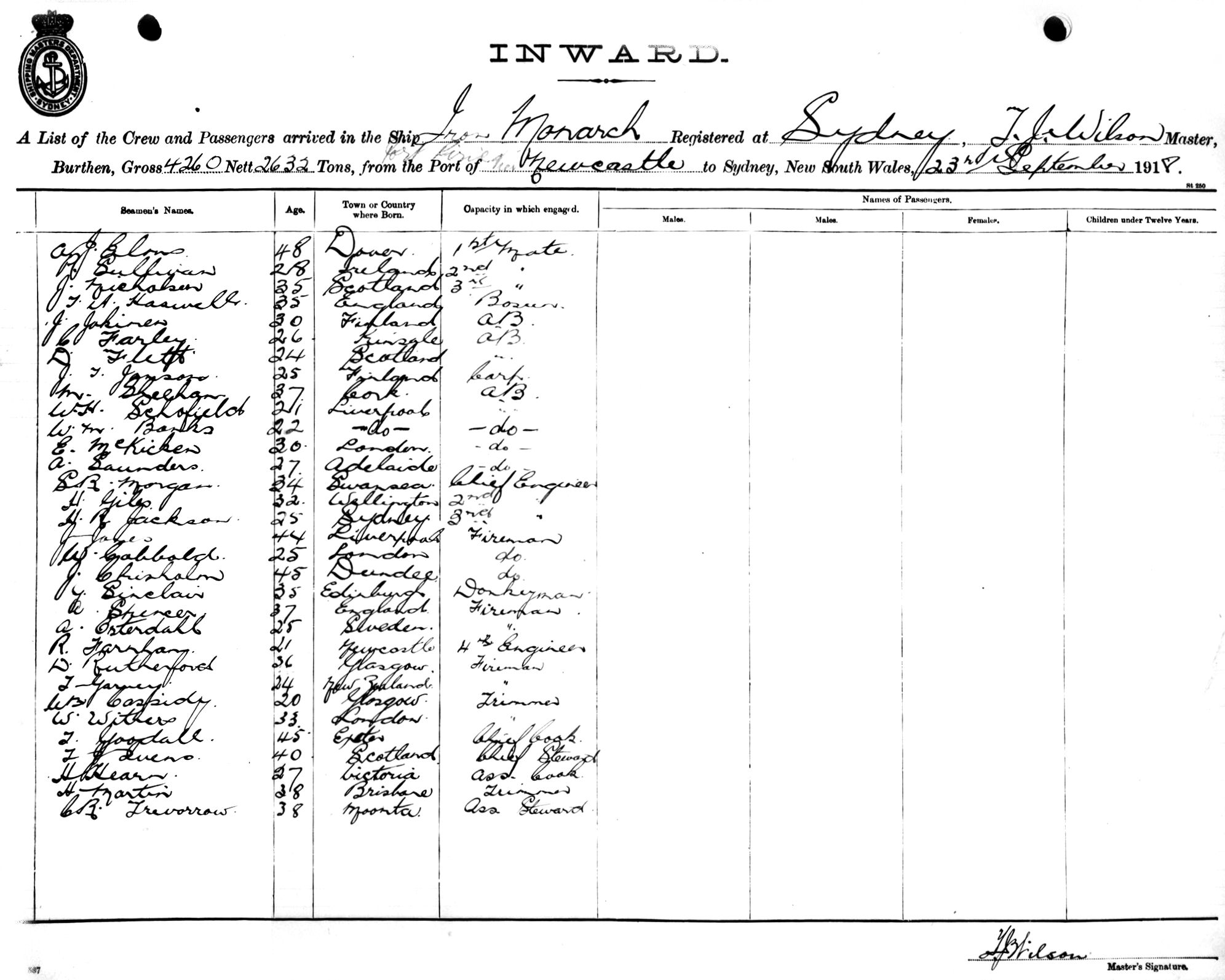 IRON MONARCHOF SYDNEY, T. J. WILSON, MASTER, BURTHEN 4260//2632 TONS FROM THE PORT OF PORT PIRIE VIA NEWCASTLE TO SYDNEY, NEW SOUTH WALES, 23RD SEPTEMBER, 1918 |