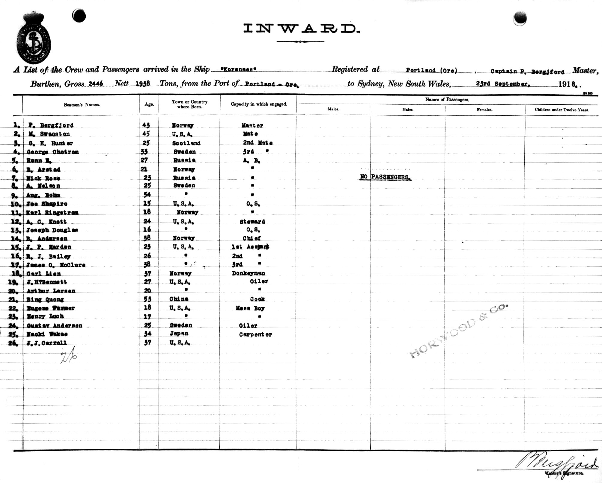 KORSNAESOF PORTLAND, OREGON, P. BERGJFORD, MASTER, BURTHEN 2446/1938 TONS FROM THE PORT OF PORTLAND TO SYDNEY NEW SOUTH WALES, 23RD SEPTEMBER, 1918 |
