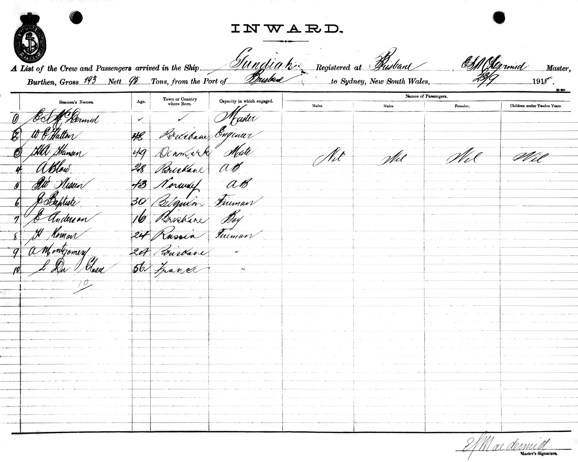 GUNDIAHOF BRISBANE, E. S. MCDERMID, MASTER, BURTHEN 193/95 TONS FROM THE PORT OF BRISBANE TO SYDNEY, NEW SOUTH WALES, 23RD SEPTEMBER, 1918 |