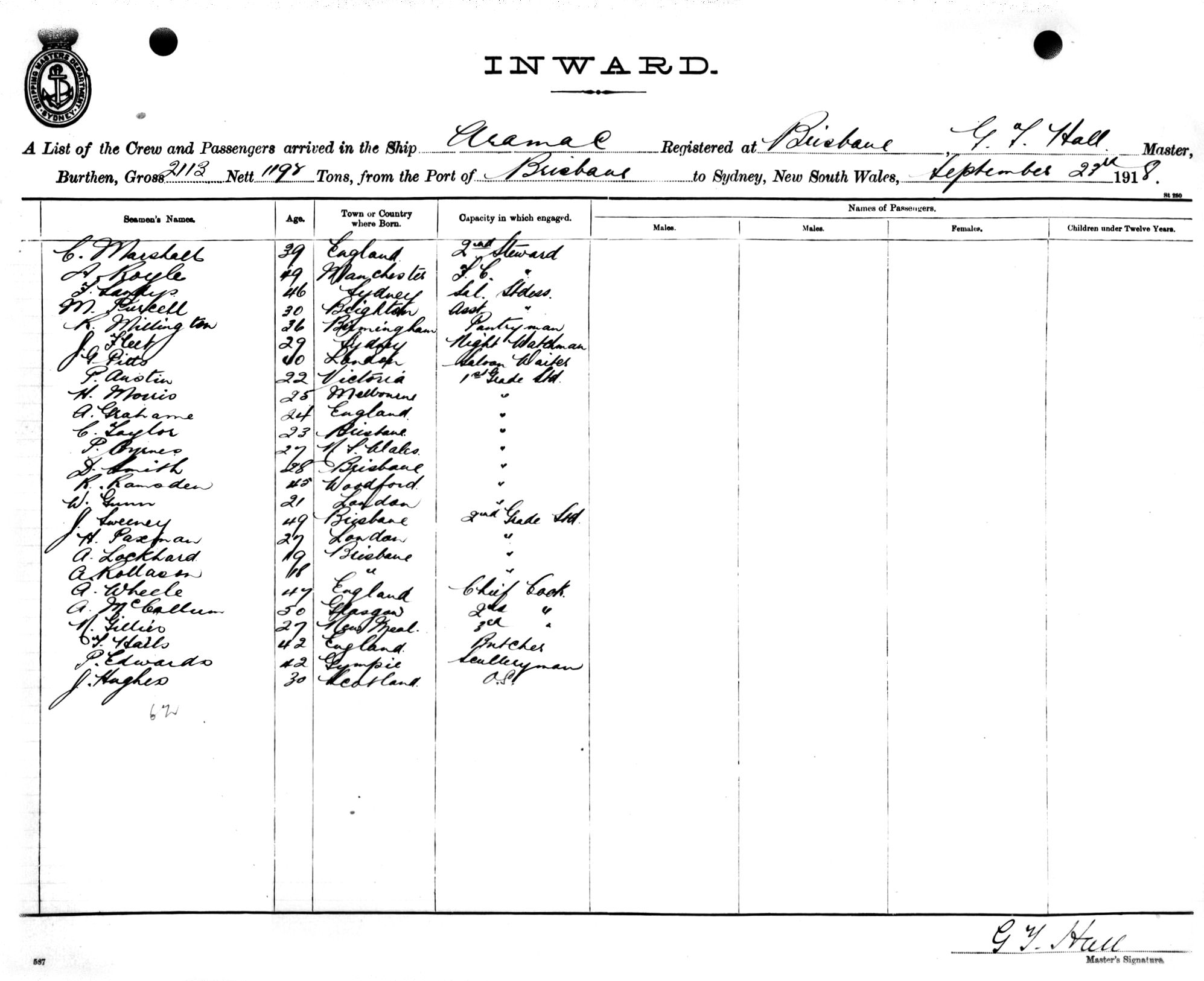 ARAMACOF BRISBANE, G. T. HALL, MASTER, BURTHEN 2113/1192 TONS FROM THE PORT OF BRISBANE TO SYDNEY, NEW SOUTH WALES, 23RD SEPTEMBER, 1918 |