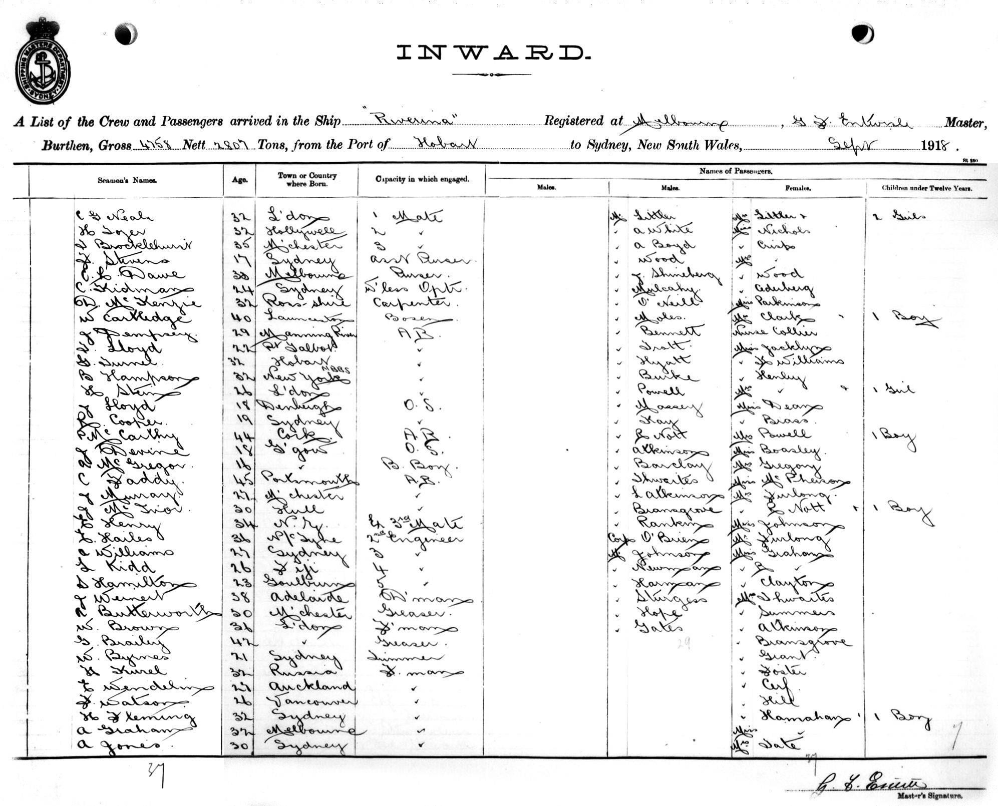 RIVERINAOF MELBOURNE, G. F. ENTWISLE, MASTER, BURTHEN 4758/2807 TONS FROM THE PORT OF HOBART TO SYDNEY, NEW SOUTH WALES, (23RD) SEPTEMBER, 1918 |