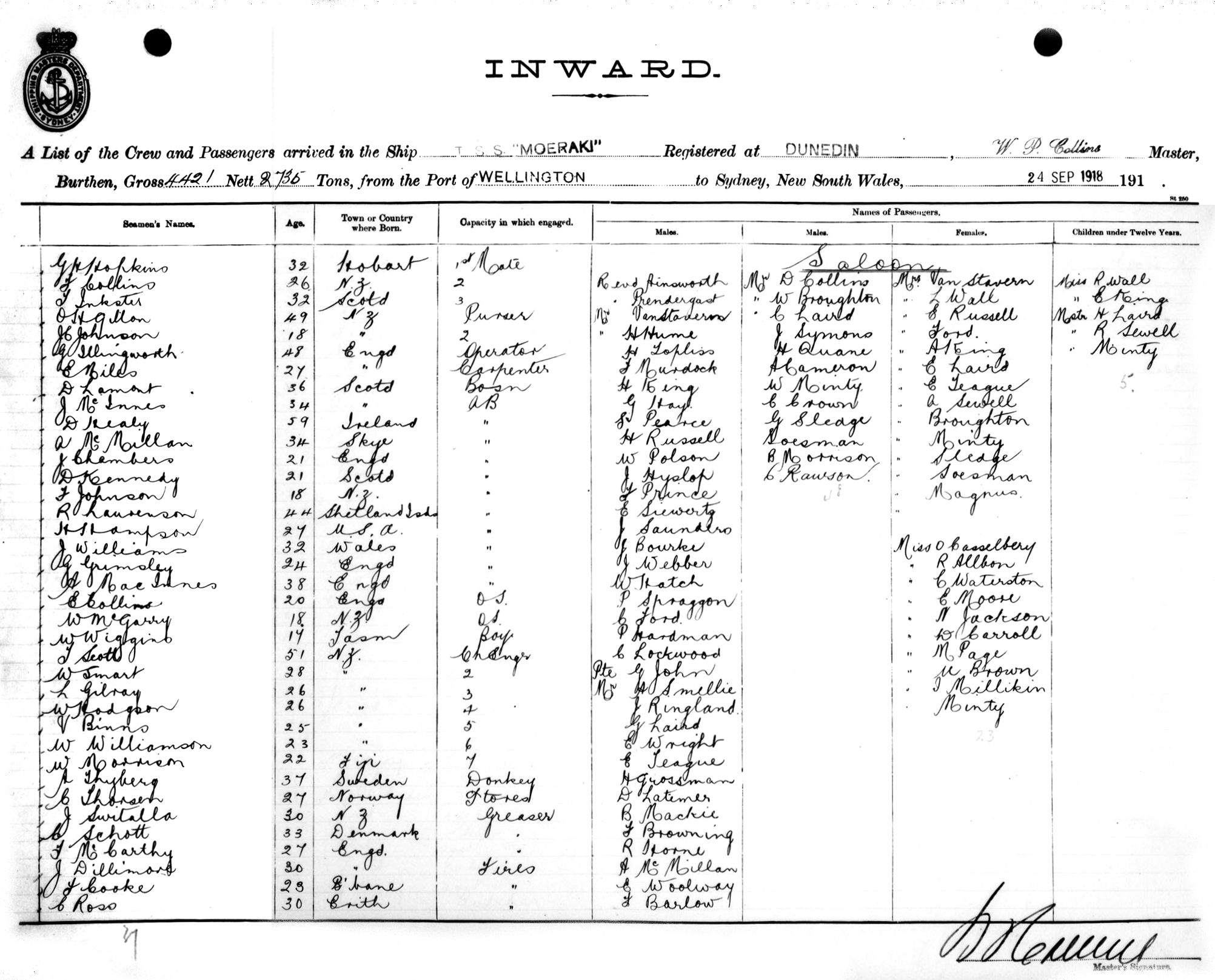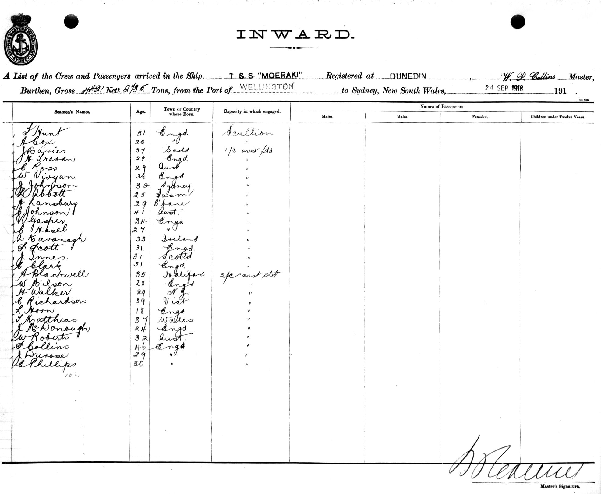 MOERAKIOF DUNEDIN, W. P. COLLINS, MASTER, BURTHEN 4421/2735 TONS FROM THE PORT OF WELLINGTON TO SYDNEY, NEW SOUTH WALES, 24TH SEPTEMBER, 1918 |