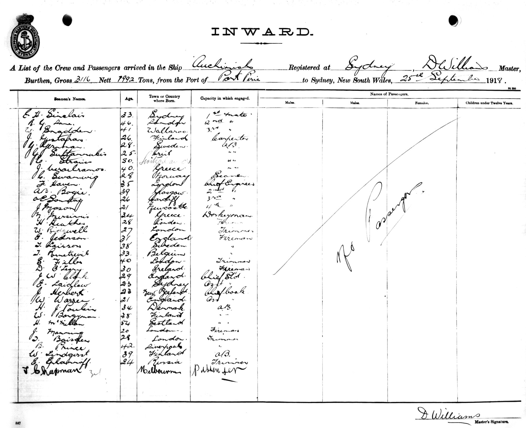 AUCHINISHOF SYDNEY, D. WILLIAMS, MASTER, BURTHEN 3116/1992 TONS FROM THE PORT OF PORT PIRIE TO SYDNEY, NEW SOUTH WALES, 25TH SEPTEMBER,1918 |