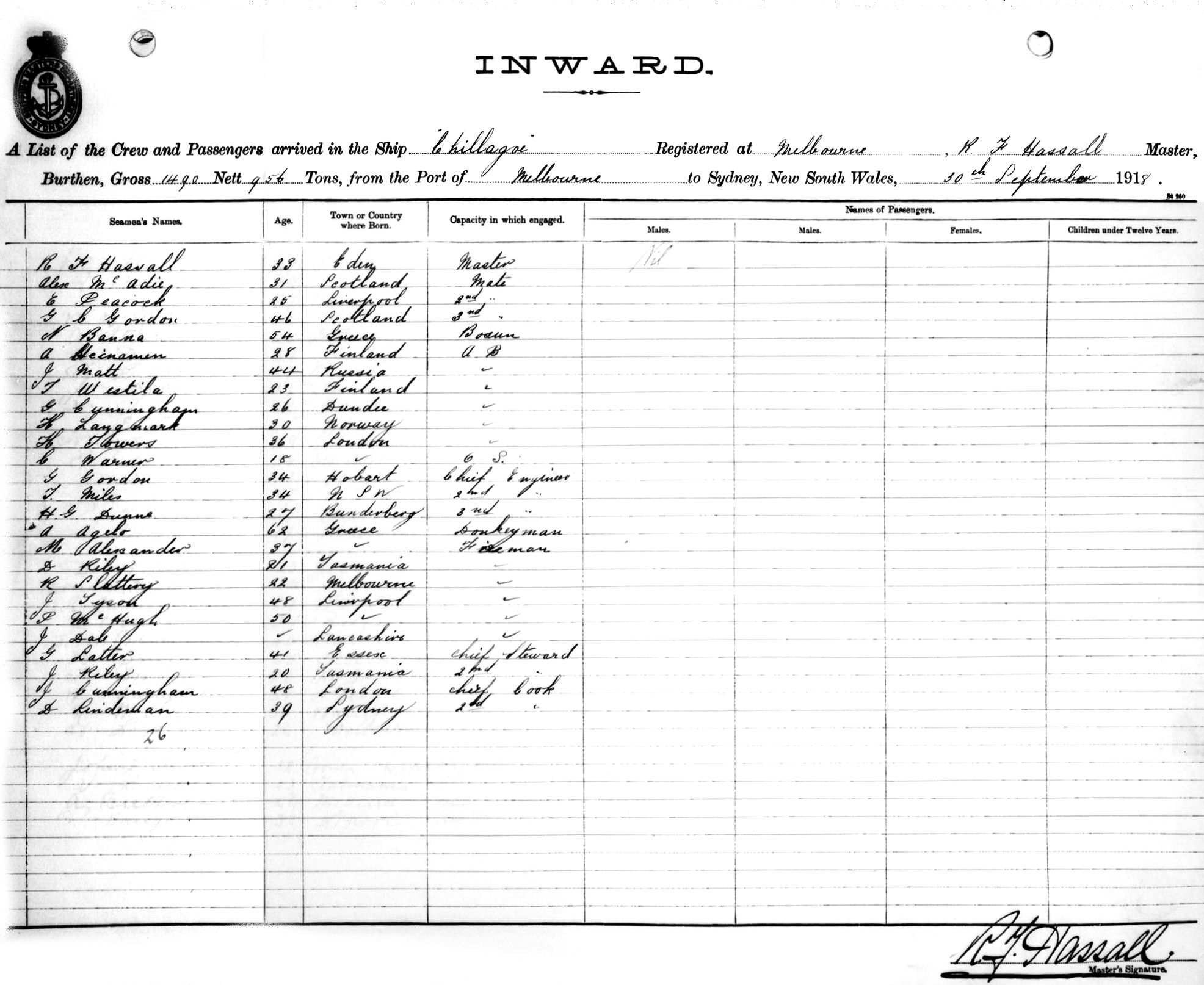 CHILLAGOEOF MELBOURNE, R. F. HASSALL, MASTER, BURTHEN 1490/956 TONS FROM THE PORT OF MELBOURNE TO SYDNEY, NEW SOUTH WALES, 30TH SEPTEMBER, 1918 |