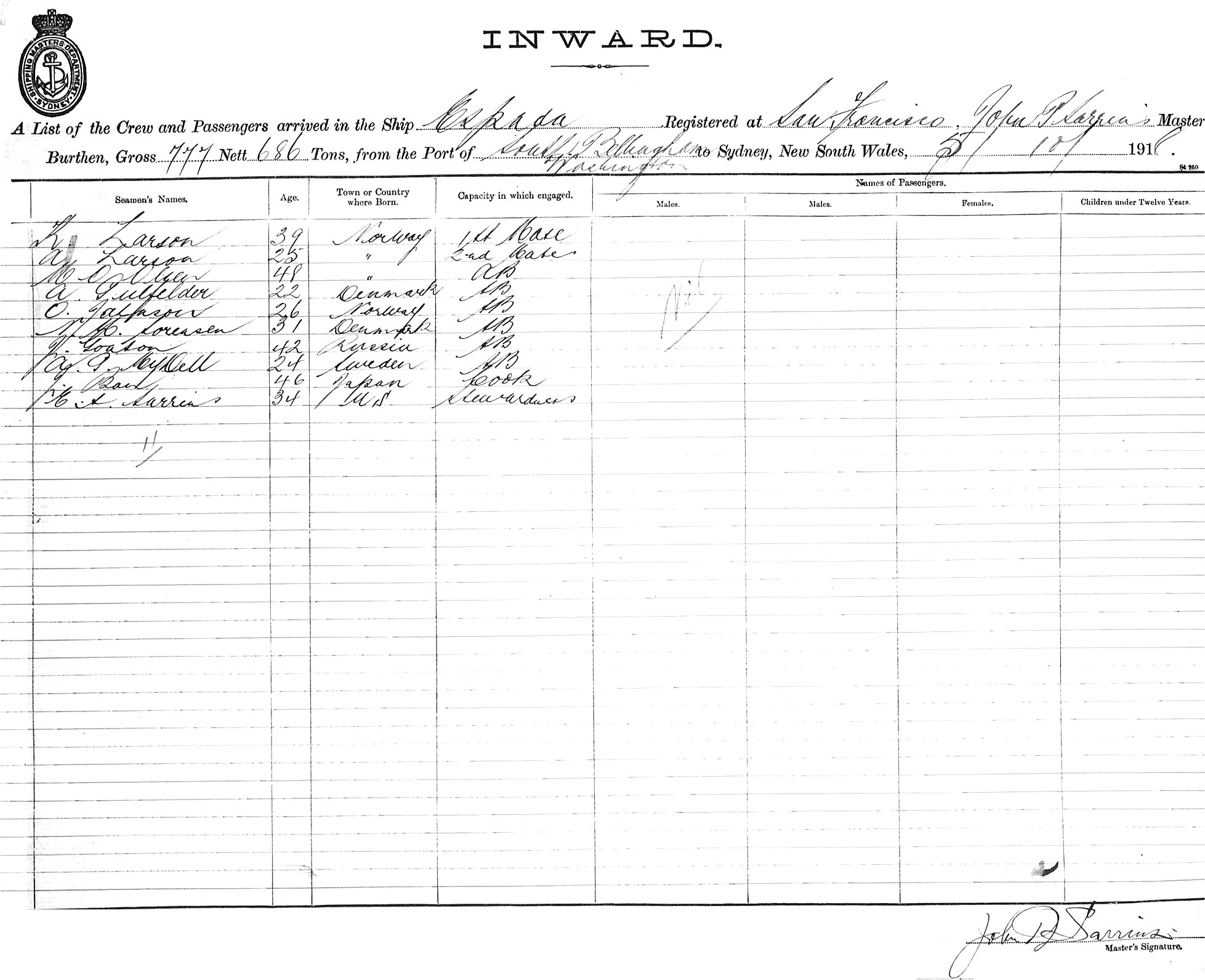 ESPADAOF SAN FRANCISCO, JOHN P. SARRINS, MASTER, BURTHEN 777/686 TONS FROM THE PORT OF SOUTH BELLINGHAM, WASHINGTON TO SYDNEY, NEW SOUTH WALES, 5TH OCTOBER 1918 |