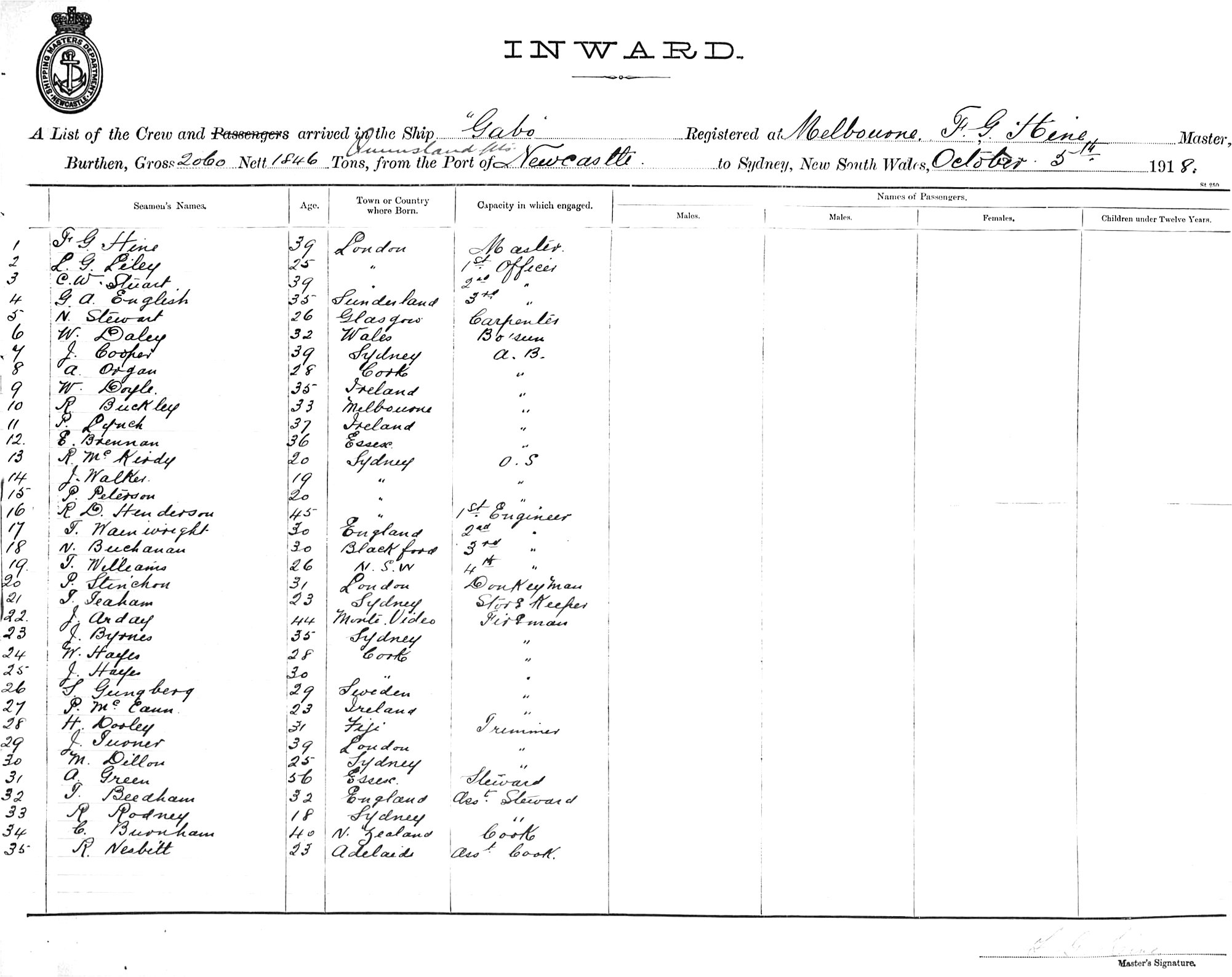 GABOOF MELBOURNE, F. G. HINE, MASTER, BURTHEN 2060/1846 TONS FROM QUEENSLAND PORTS via NEWCASTLE TO SYDNEY, NEW SOUTH WALES, 5TH OCTOBER 1918 |