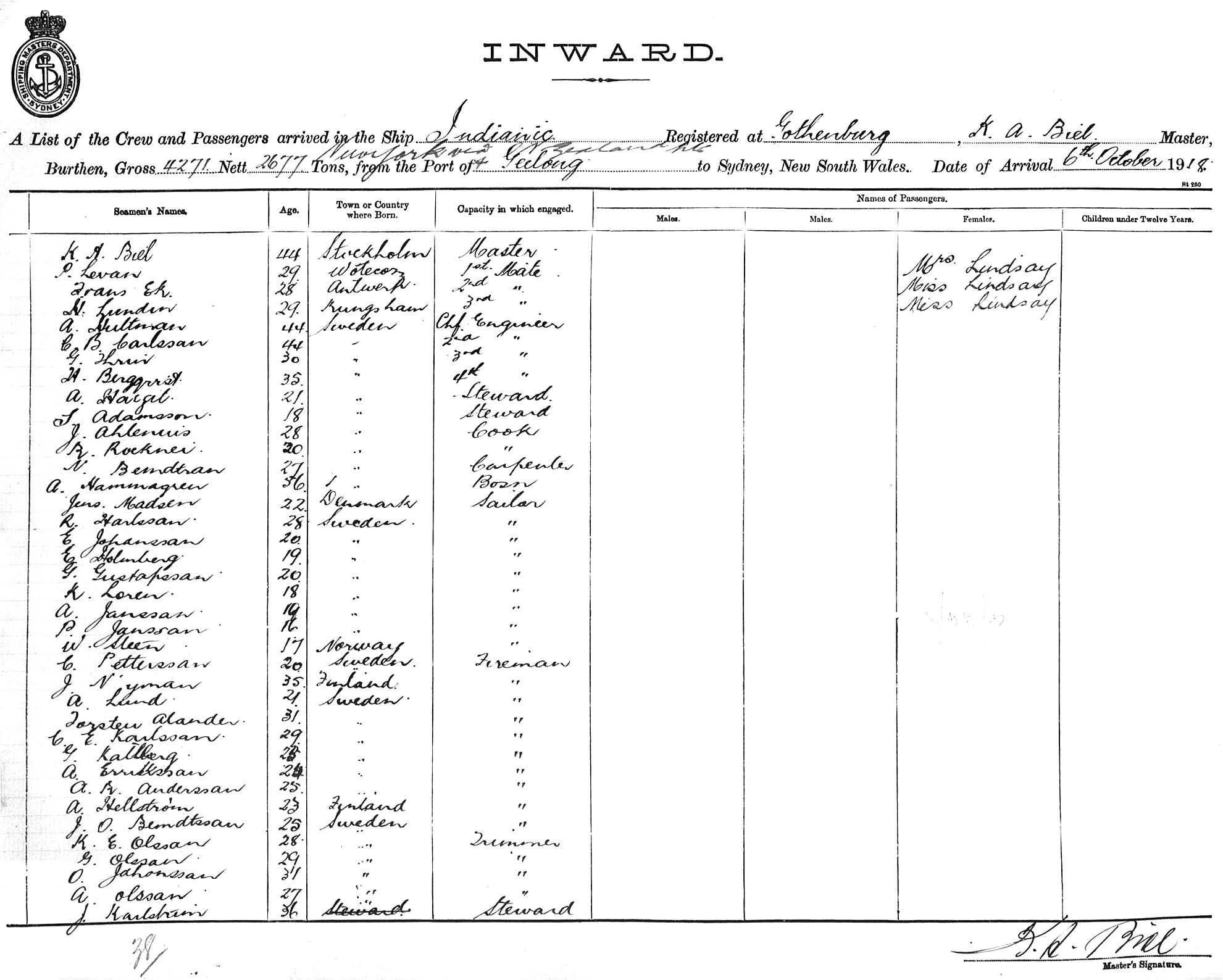 INDIANICOF GOTHENBURG, K. A. BIEL, MASTER, BURTHEN 4271/2677 TONS FROM THE PORT OF NEW YORK via NEW ZEALAND PORTS & GEELONG TO SYDNEY, NEW SOUTH WALES, 6TH OCTOBER 1918 |