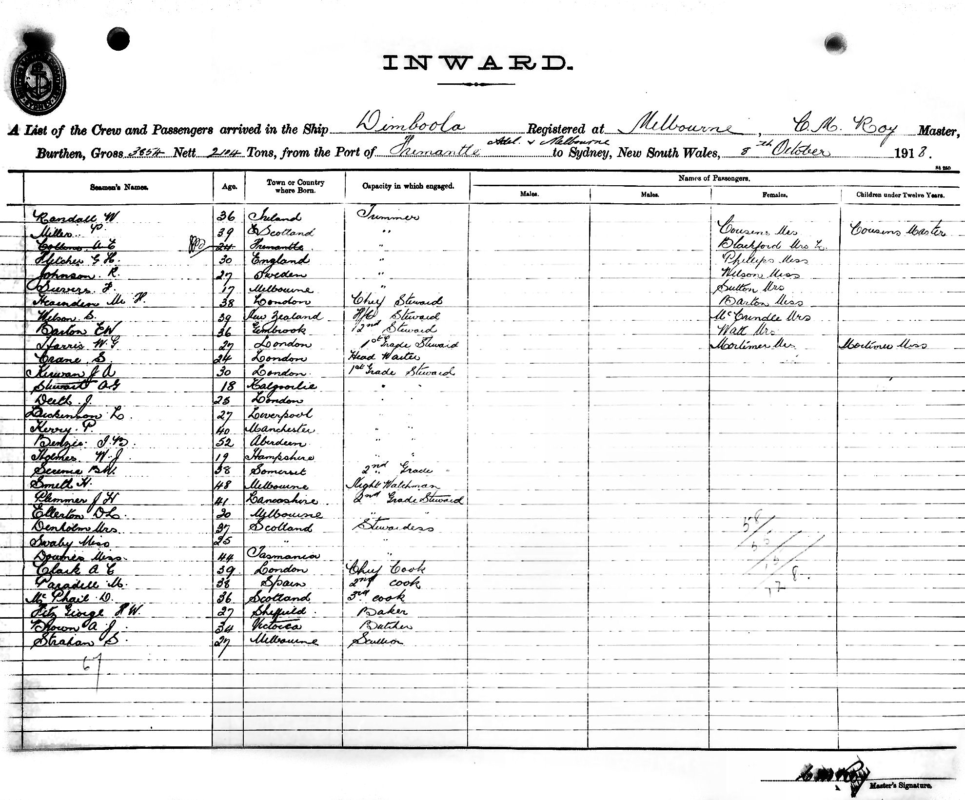 DIMBOOLAOF MELBOURNE, C. M. ROY, MASTER, BURTHEN 3854/2114 TONS FROM THE PORTS OF FREMANTLE, ADELAIDE & MELBOURNE TO SYDNEY, NEW SOUTH WALES, 8TH OCTOBER 1918 |