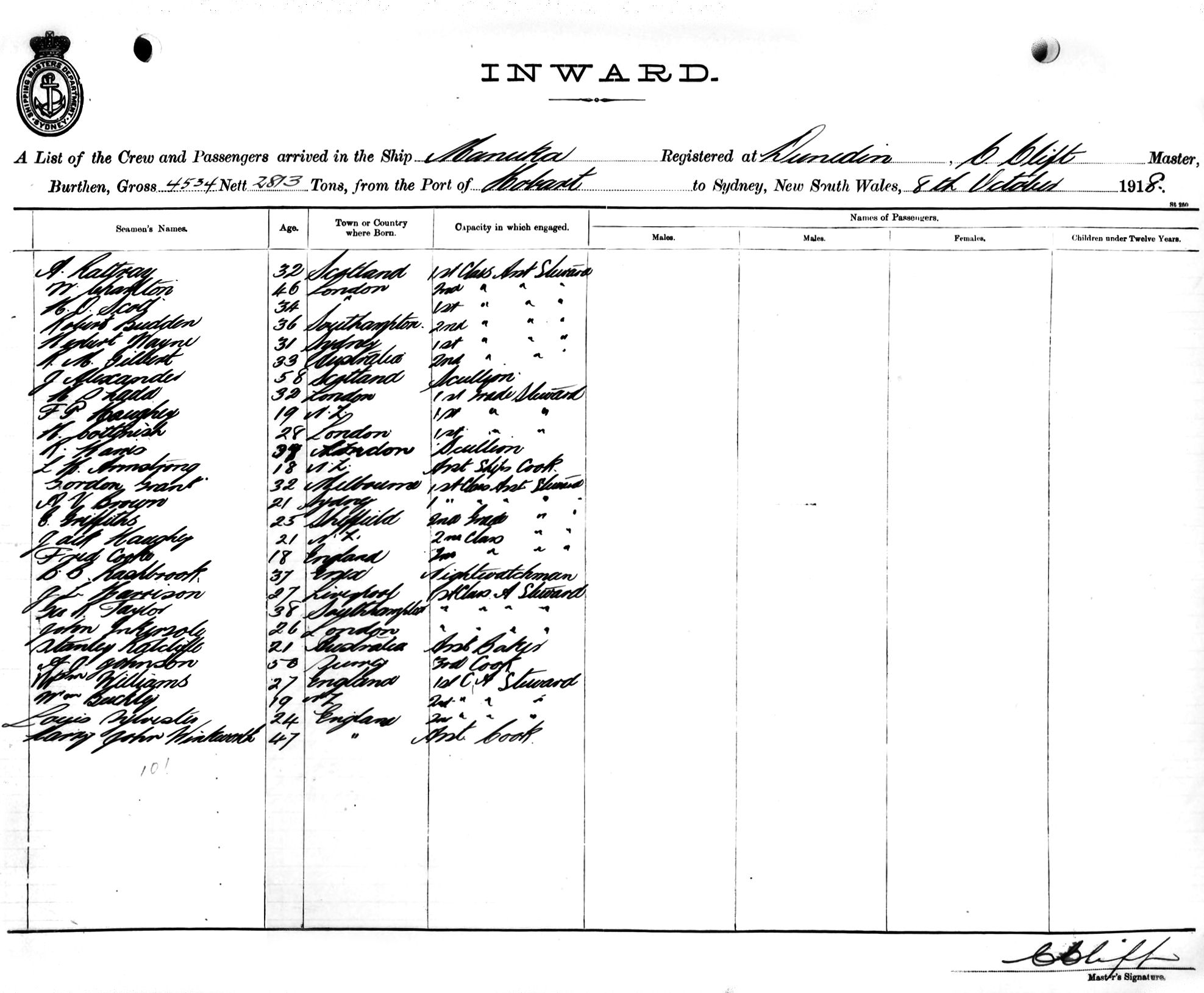 MANUKAOF DUNEDIN, C. CLIFT, MASTER, BURTHEN 4584/2813 TONS FROM THE PORT OF HOBART TO SYDNEY, NEW SOUTH WALES, 8TH OCTOBER 1918 |