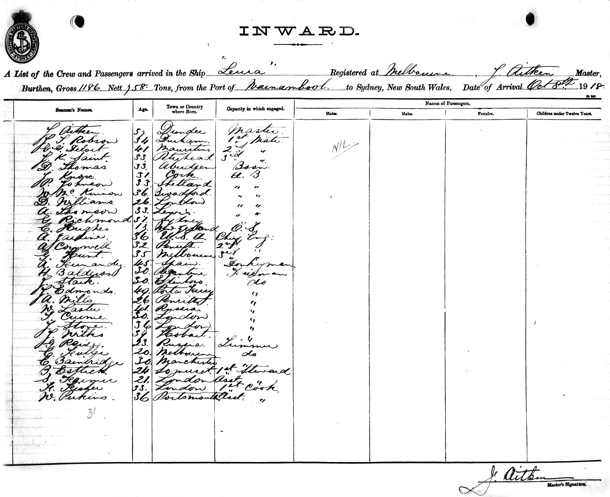 LEURAOF MELBOURNE, J. AITKEN, MASTER, BURTHEN 1186/758 TONS FROM THE PORT OF WARRNAMBOOL TO SYDNEY, NEW SOUTH WALES, 8TH OCTOBER 1918 |