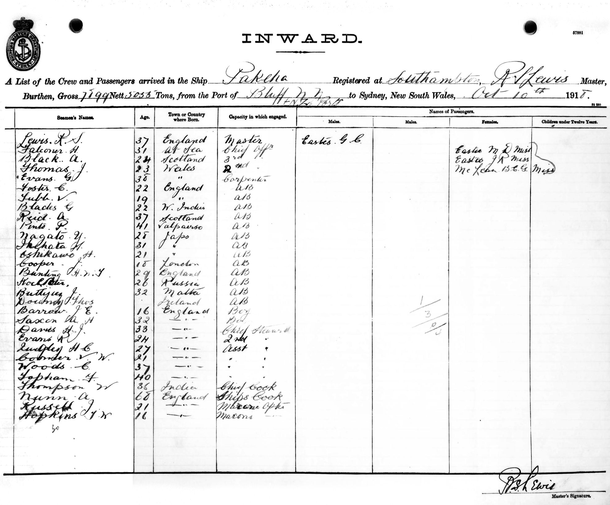 PAKEHAOF SOUTHAMPTON, R. S. LEWIS, MASTER, BURTHEN 7199/5055 TONS FROM THE PORT OF BLUFF & N.Z. PORTS TO SYDNEY, NEW SOUTH WALES, 10TH OCTOBER 1918 |