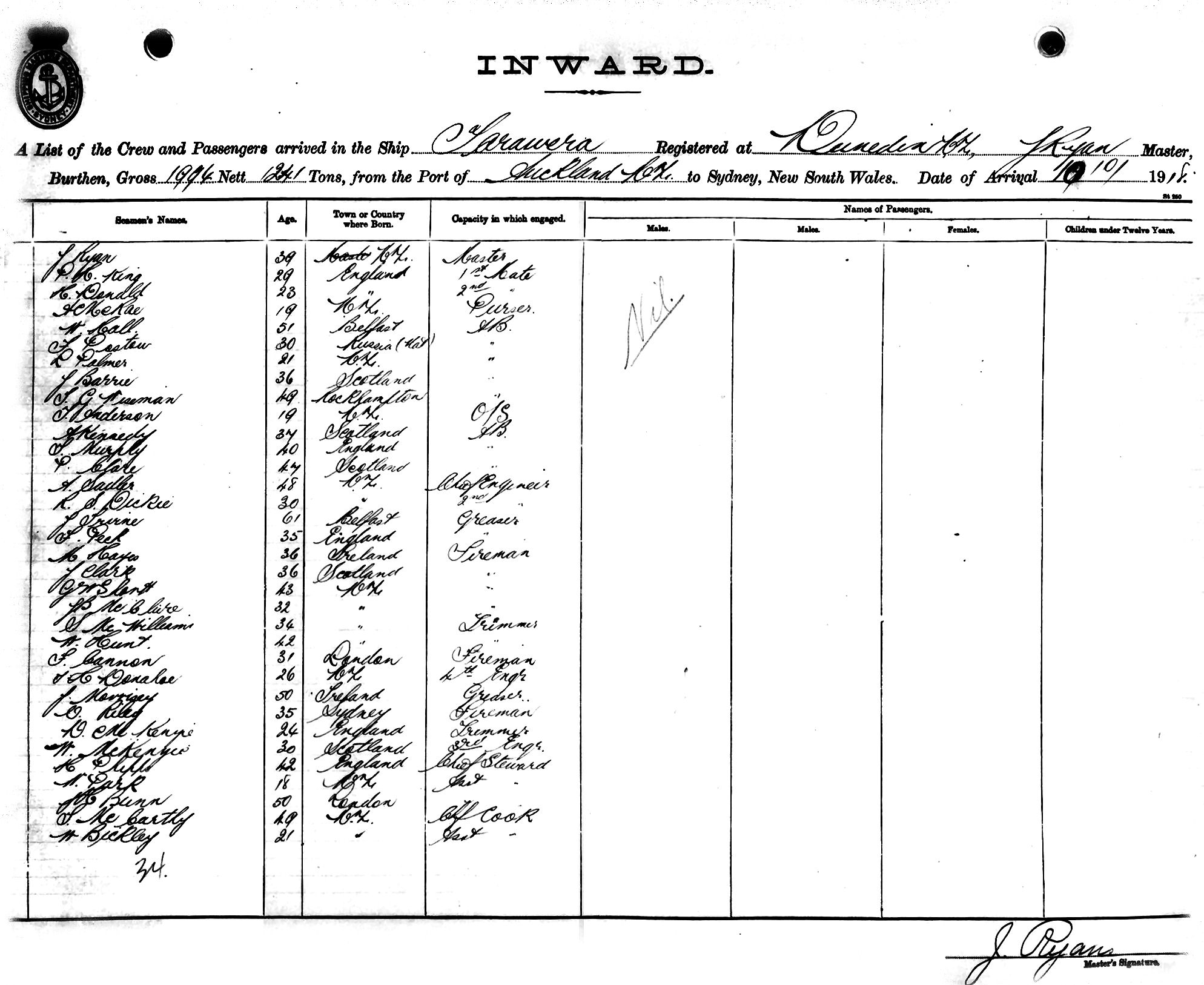 TARAWERAOF DUNEDIN, J. RYAN, MASTER, BURTHEN 1994/1241 TONS FROM THE PORT OF AUCKLAND TO SYDNEY, NEW SOUTH WALES, 10TH OCTOBER 1918 |