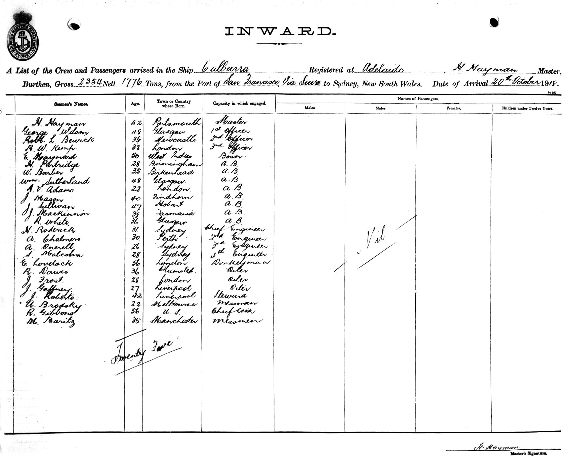 CULBURRAOF ADELAIDE, H. HAYMAN, MASTER, BURTHEN 2354/1776 TONS FROM THE PORT OF SAN FRANCISCO via SUVA TO SYDNEY, NEW SOUTH WALES, 20TH OCTOBER 1918 |