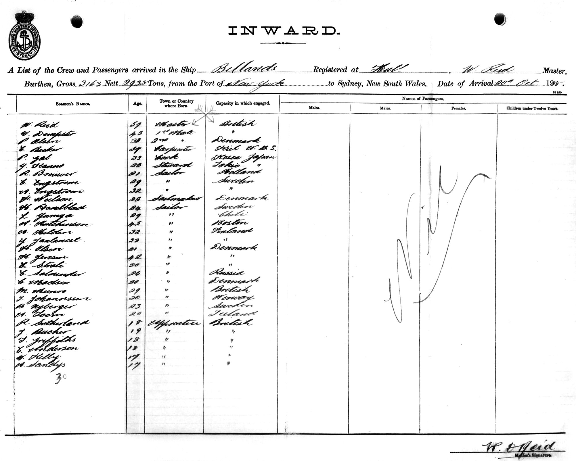 Mariners and ships in Australian Waters | BELLANDSOF HULL, W. REID, MASTER, BURTHEN 3163/2938 TONS FROM THE PORT OF NEW YORK TO SYDNEY, NEW SOUTH WALES, 20TH OCTOBER 1918 |