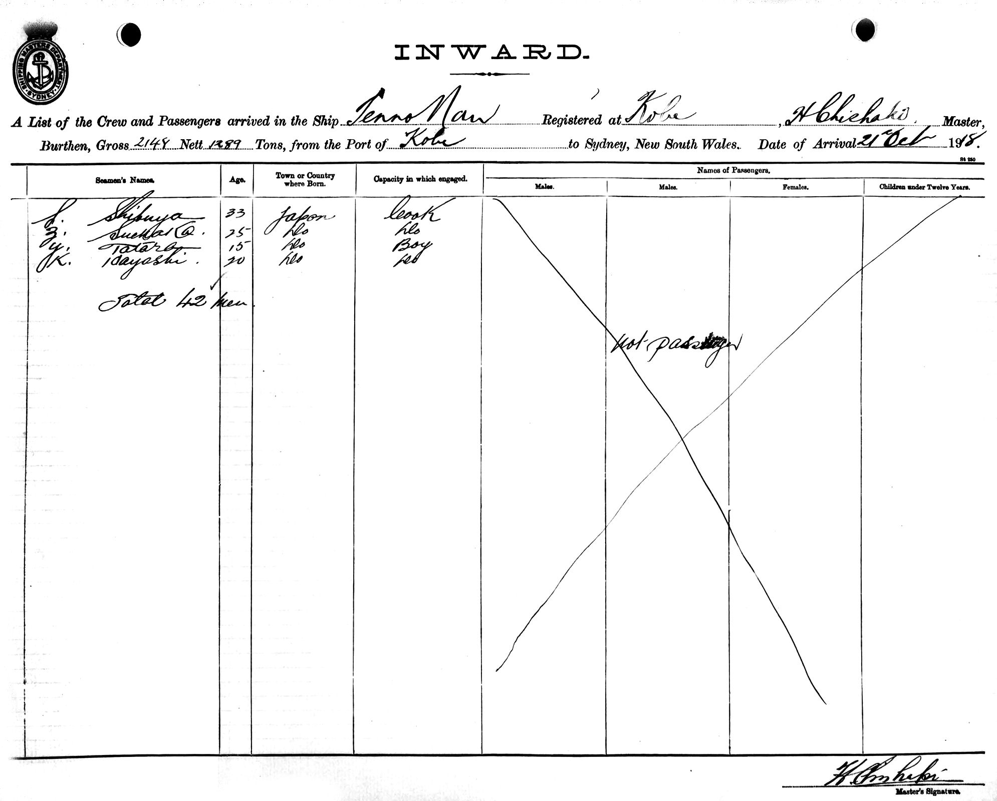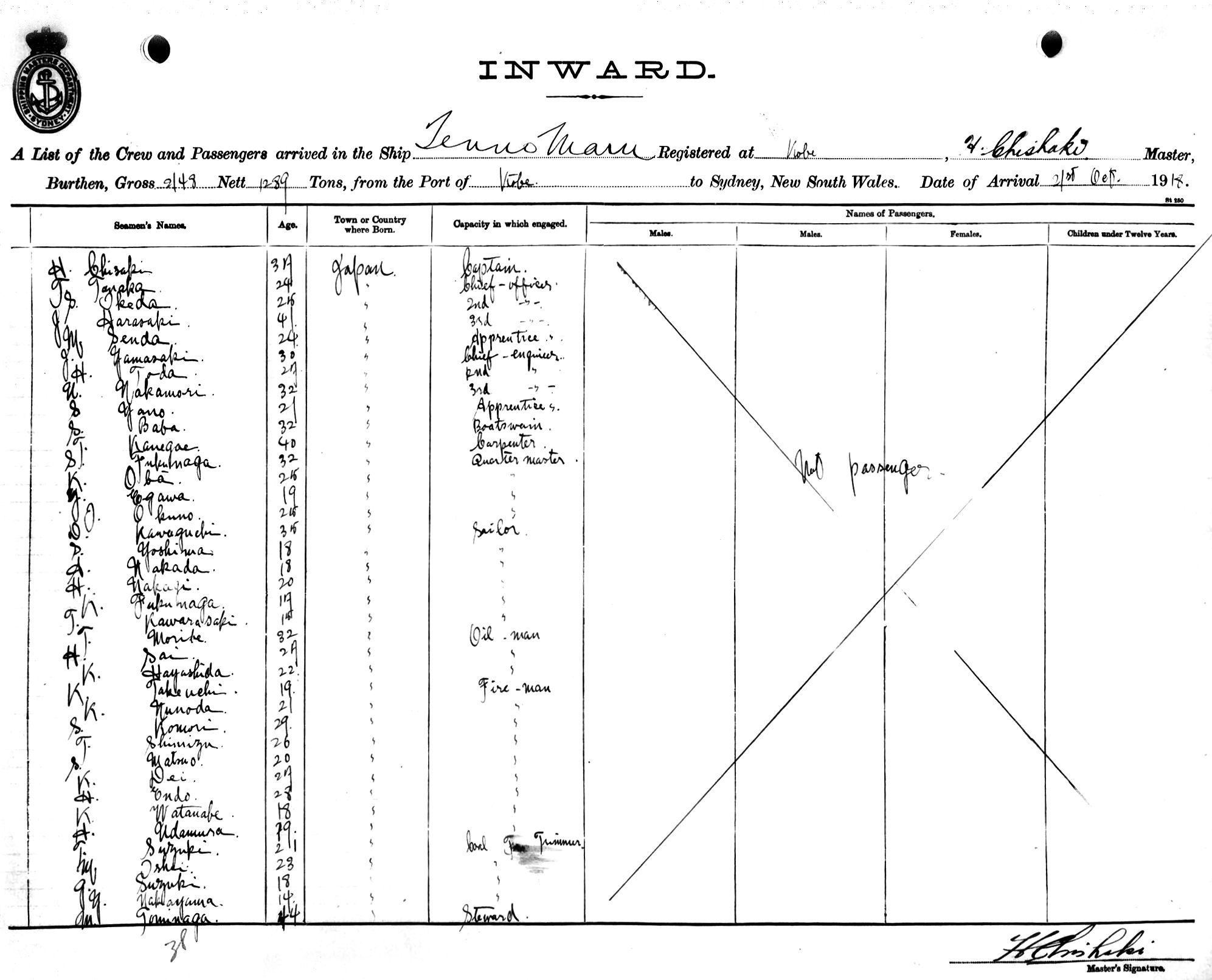 TENNO MARUOF KOBE, H. CHISHAKI, MASTER, BURTHEN 2148/1289 TONS FROM THE PORT OF KOBE, JAPAN TO SYDNEY, NEW SOUTH WALES, 21ST OCTOBER 1918 |