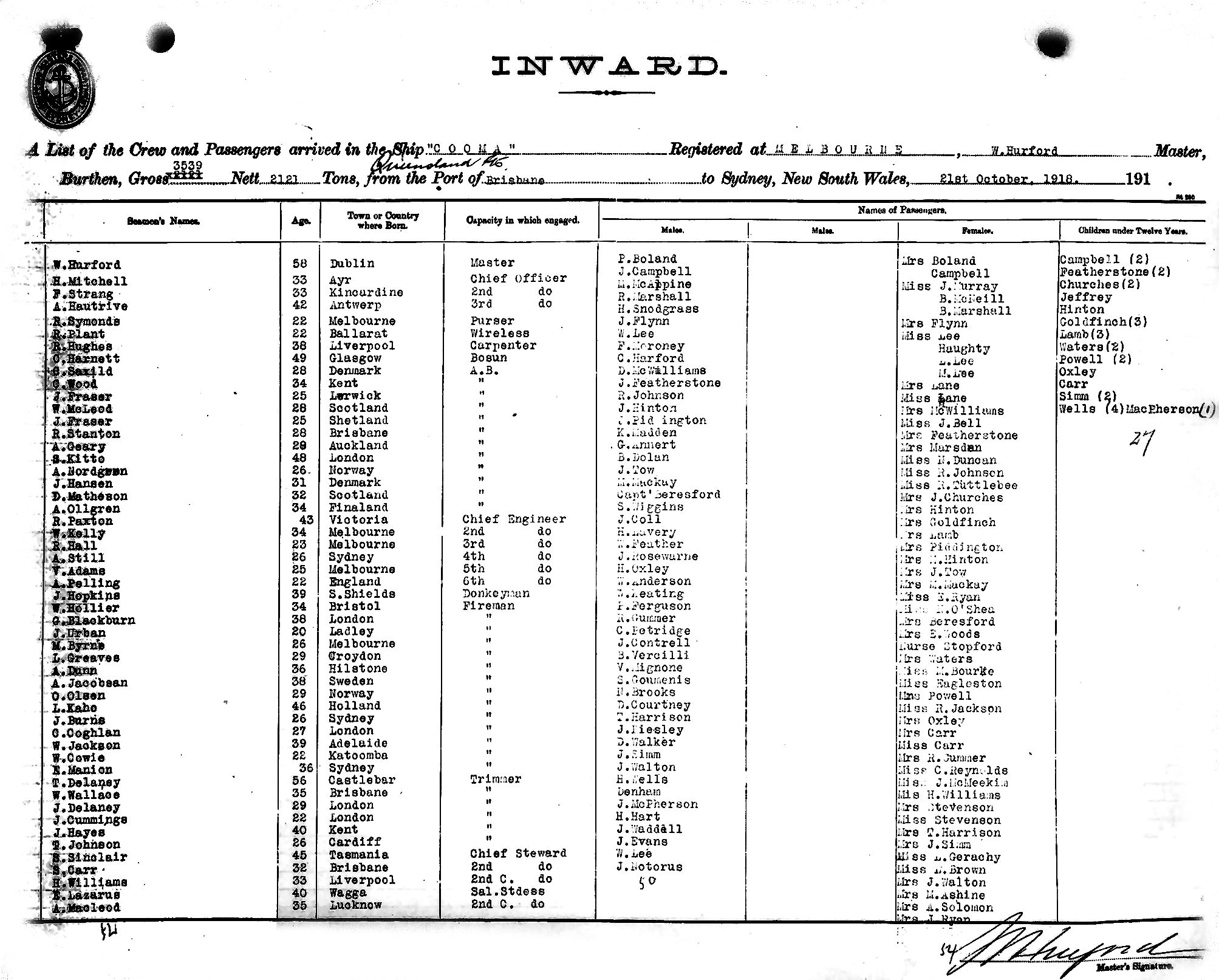 COOMAOF SYDNEY, W. HURFORD, MASTER, BURTHEN 3539/2121 TONS FROM THE PORT OF QUEENSLAND PORTS & BRISBANE TO SYDNEY, NEW SOUTH WALES, 21ST OCTOBER 1918 |