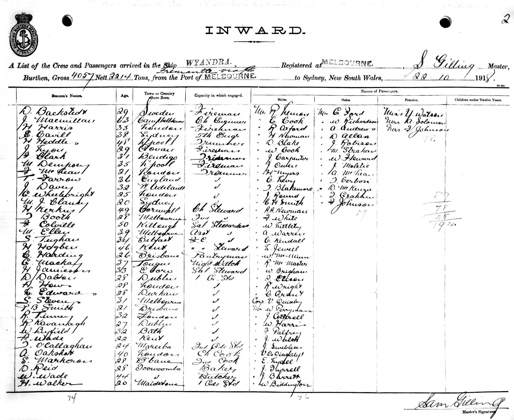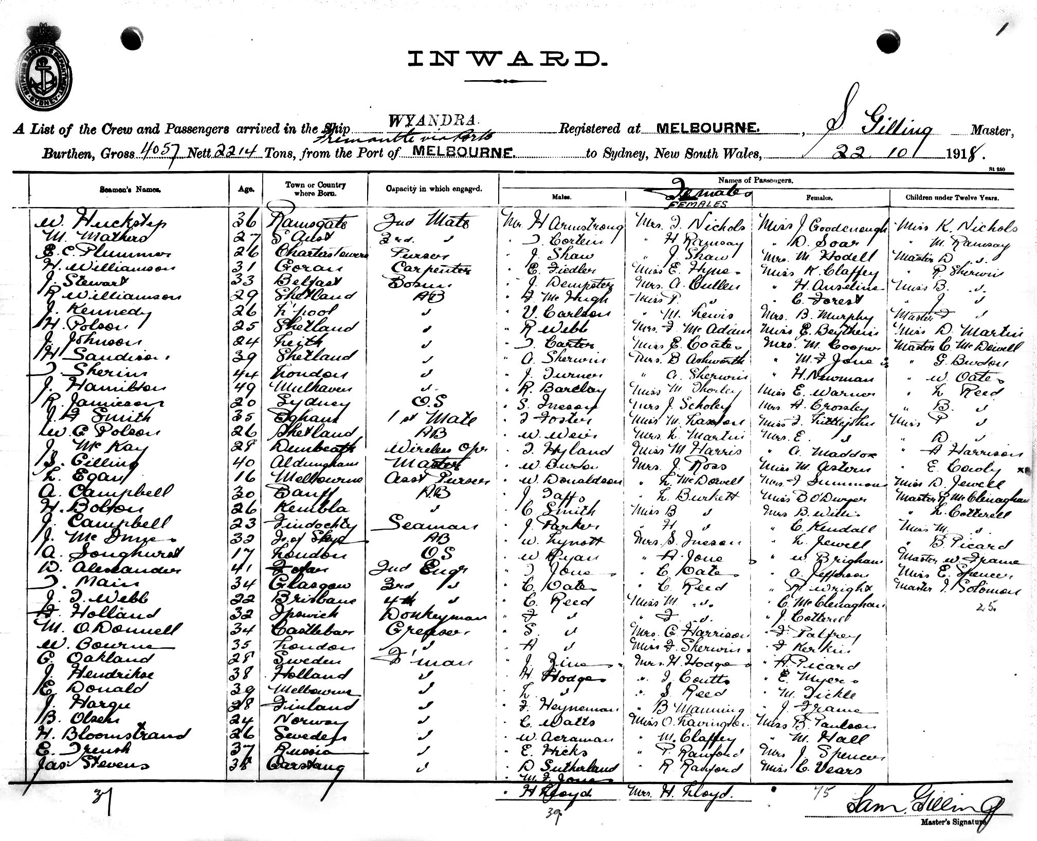 WYANDRAOF MELBOURNE, S. GILLING, MASTER, BURTHEN 4057/2214 TONS FROM THE PORT OF FREMANTLE via PORTS & MELBOURNE TO SYDNEY, NEW SOUTH WALES, 22ND OCTOBER 1918 |