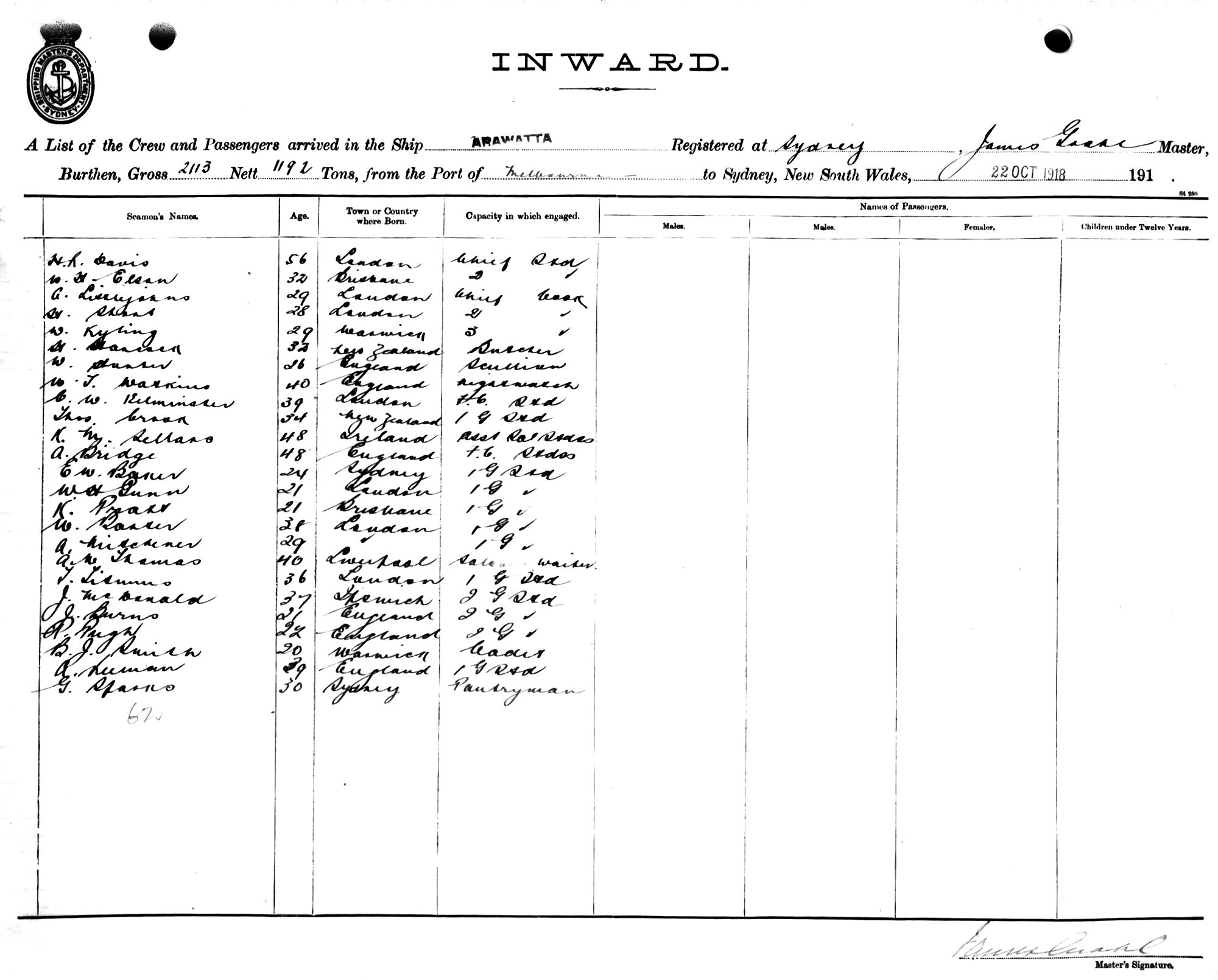 ARAWATTAOF SYDNEY, JAMES GRAHL, MASTER, BURTHEN 2113/1192 TONS FROM THE PORT OF MELBOURNE TO SYDNEY, NEW SOUTH WALES, 22ND OCTTOBER 1918 |