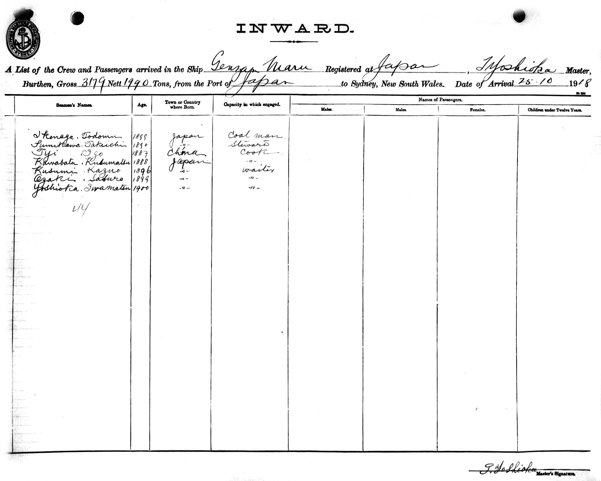 GENZAN MARUOF JAPAN, T. YOSHIOKA, MASTER, BURTHEN 3179/1990 TONS FROM THE PORT OF KOBE, JAPAN TO SYDNEY, NEW SOUTH WALES, 25TH OCTOBER 1918 |