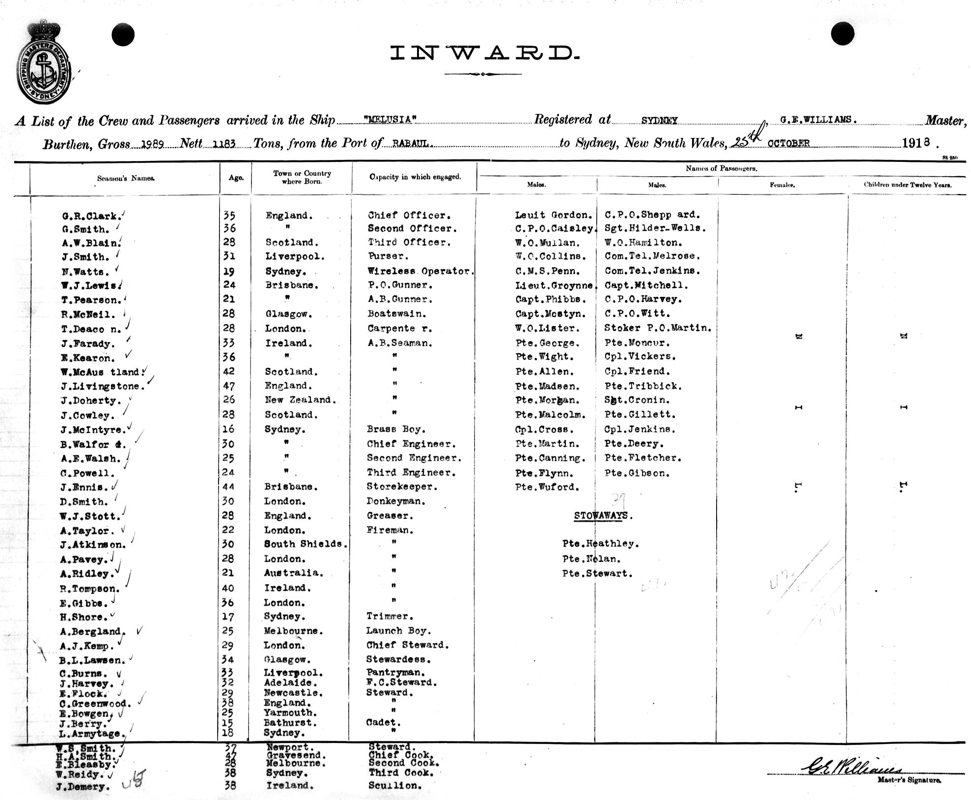 MELUSIAOF SYDNEY, G. E. WILLIAMS, MASTER, BURTHEN 1989/1183 TONS FROM THE PORT OF RABAUL TO SYDNEY, NEW SOUTH WALES, 25TH OCTOBER 1918 |