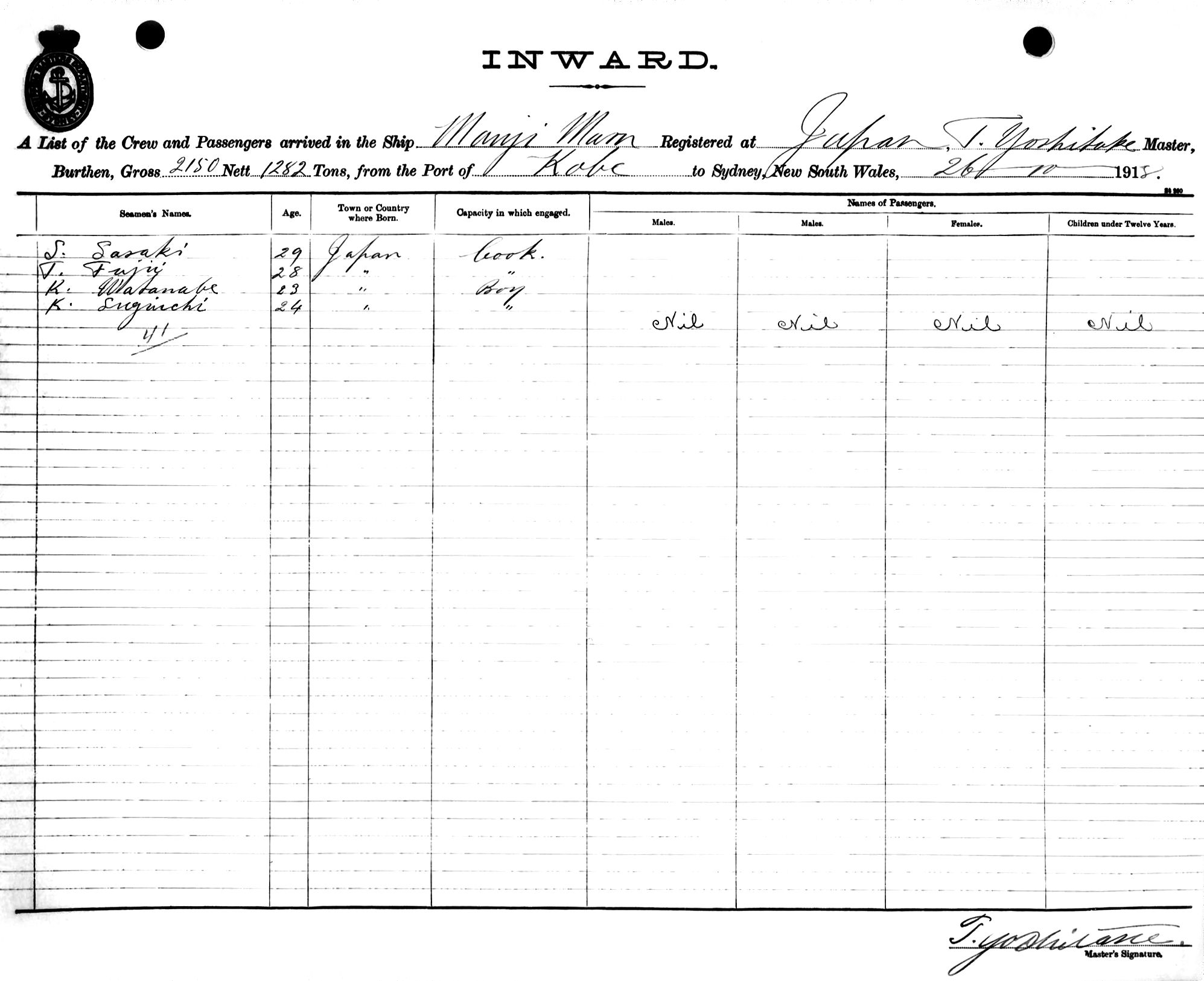MANJI MARUOF JAPAN, T. YOSHITAKE, MASTER, BURTHEN 2150/1282 TONS FROM THE PORT OF KOBE TO SYDNEY, NEW SOUTH WALES, 26TH OCTOBER 1918 |
