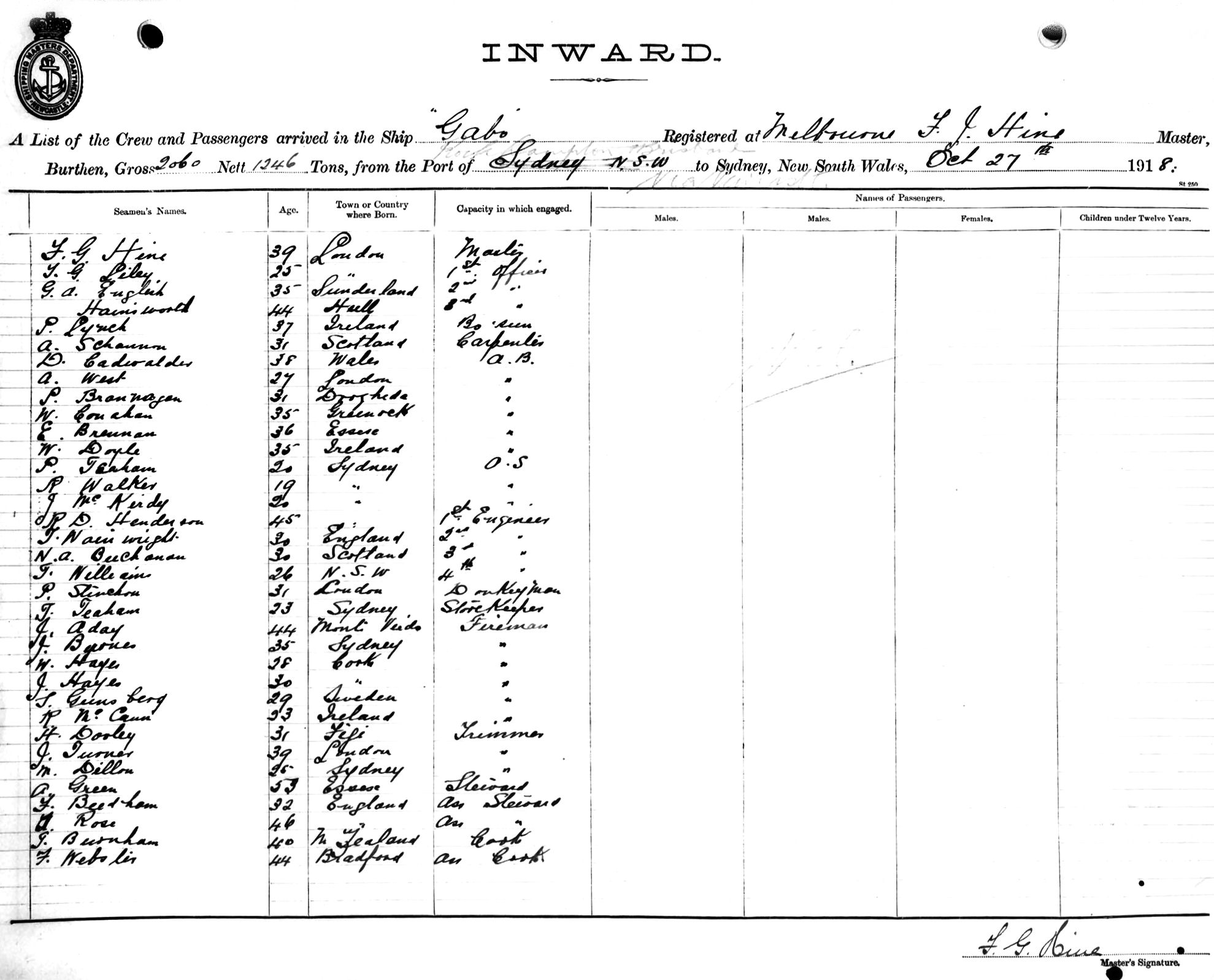 GABOOF MELBOURNE, F. G. HINE, MASTER, BURTHEN 2060/1246 TONS FROM THE PORTS OF ROCKHAMPTON & BRISBANE via NEWCASTLE TO SYDNEY, NEW SOUTH WALES, 27TH OCTOBER 1918 |