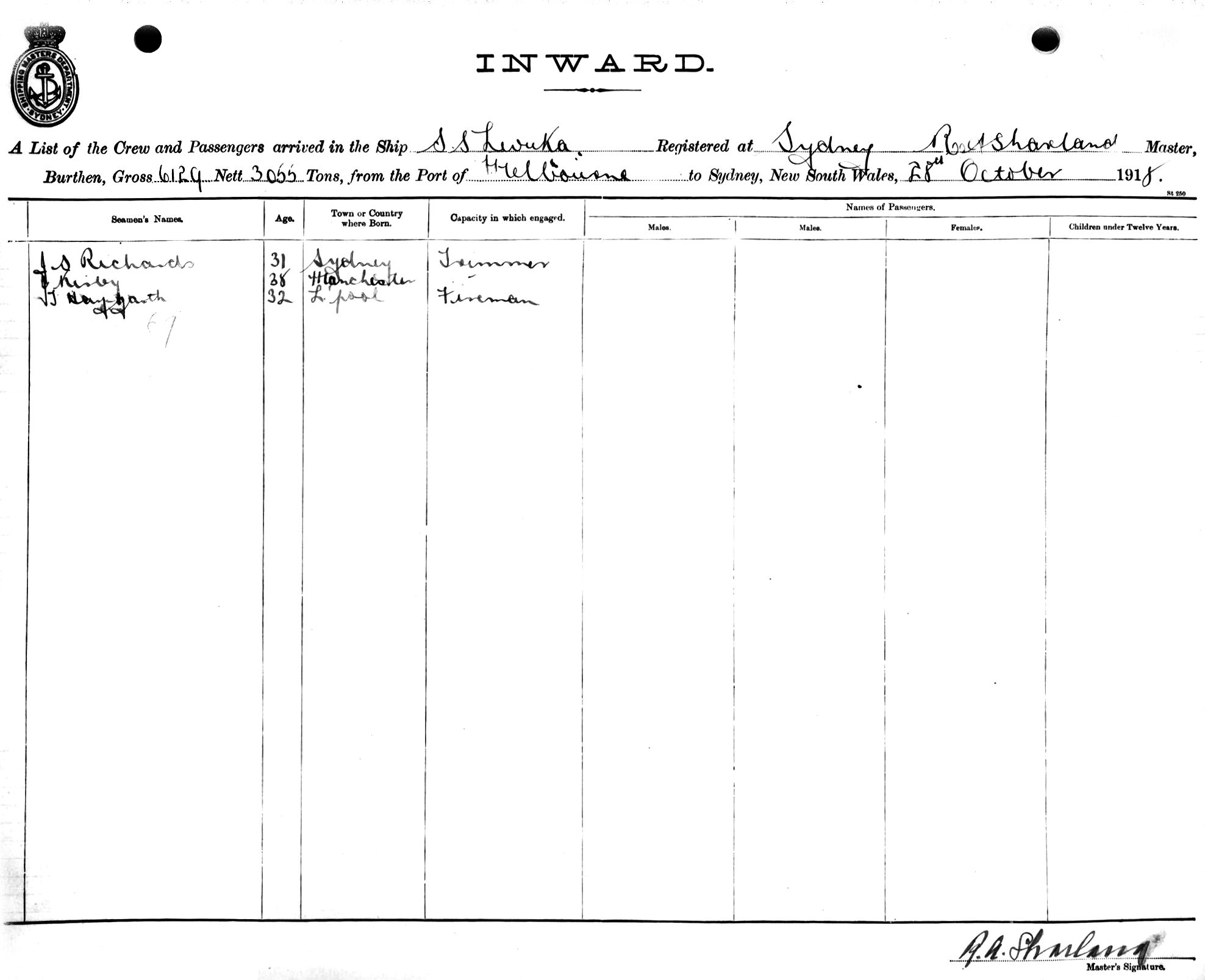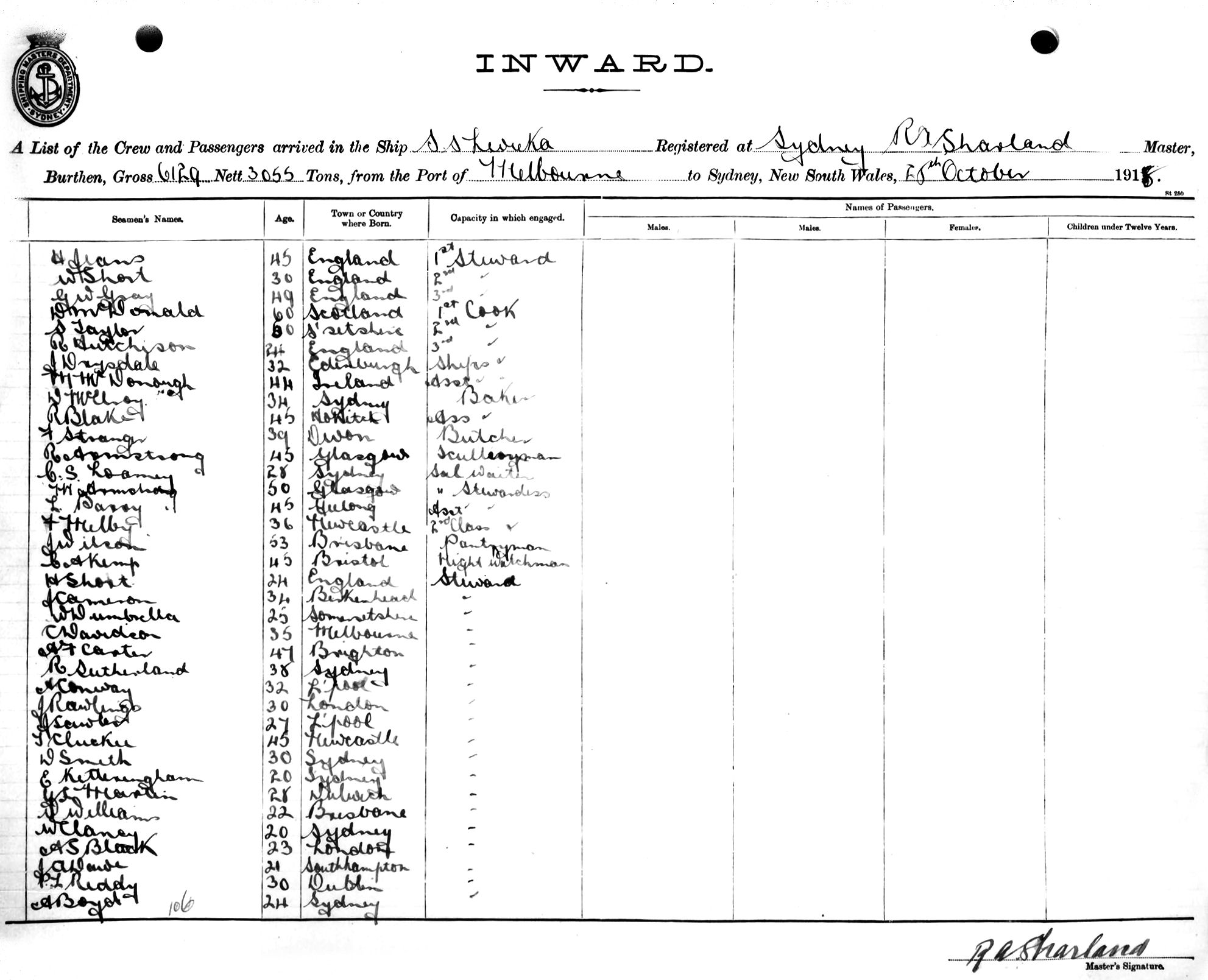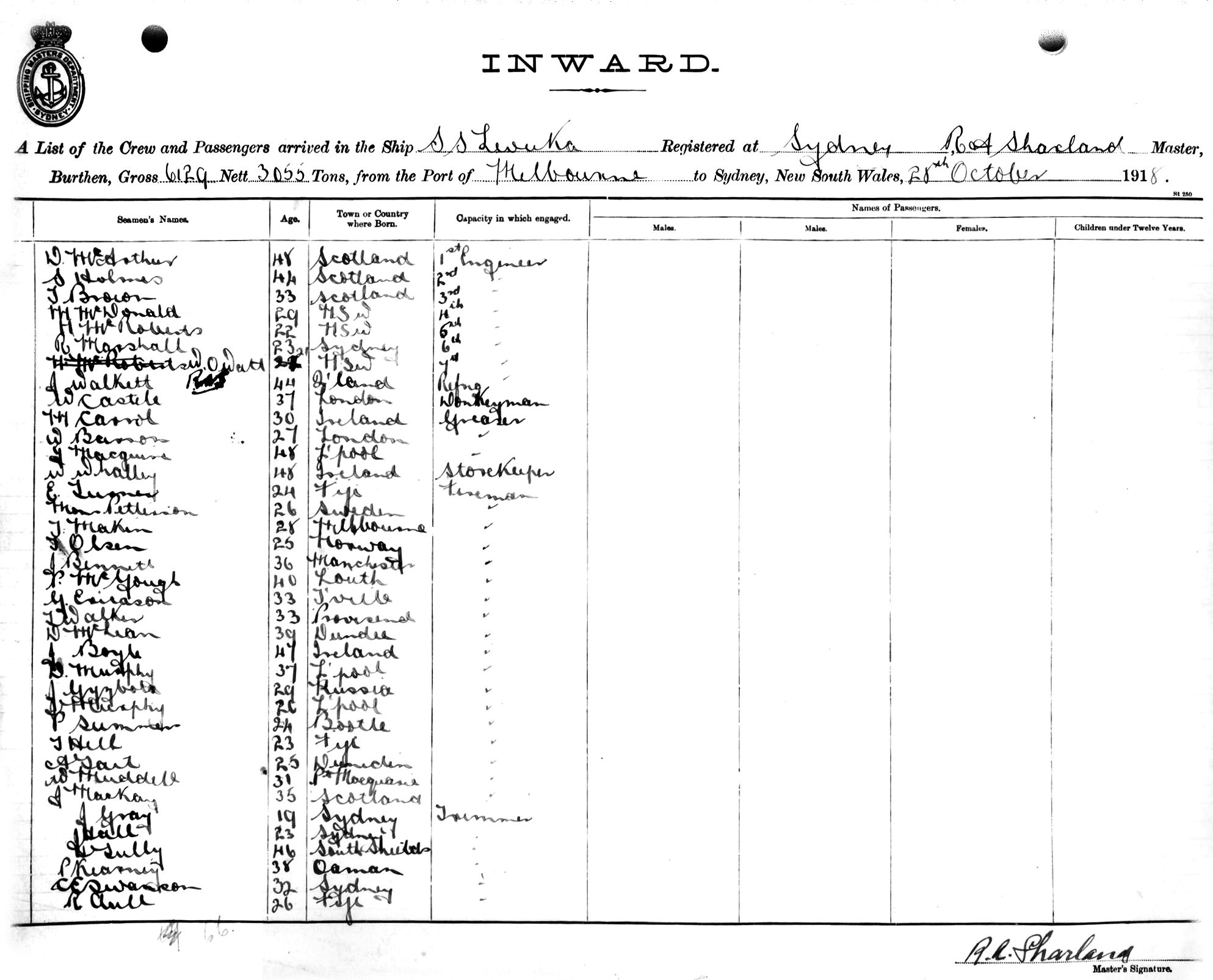 LEVUKAOF SYDNEY, R. A. SHARLAND, MASTER, BURTHEN 6129/3055TONS FROM THE PORT OF MELBOURNE TO SYDNEY, NEW SOUTH WALES, 28TH OCTOBER 1918 |