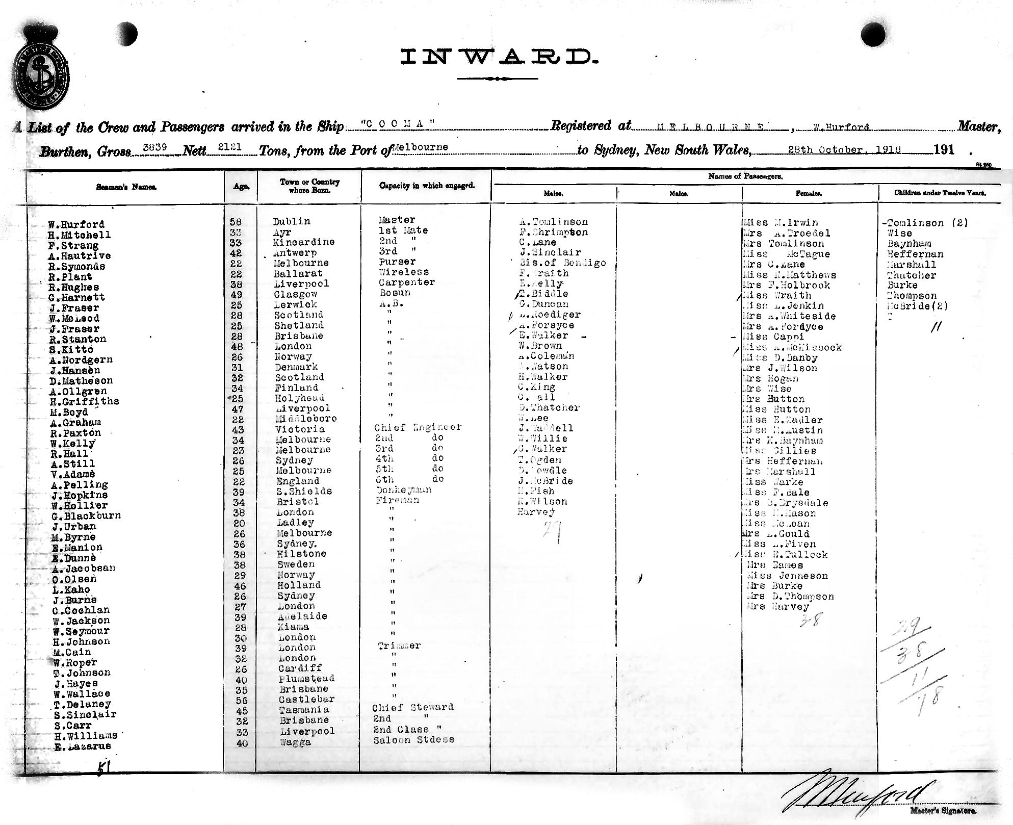 COOMAOF MELBOURNE, W. HURFORD, MASTER, BURTHEN 3839/2121 TONS FROM THE PORT OF MELBOURNE TO SYDNEY, NEW SOUTH WALES, 28TH OCTOBER 1918 |