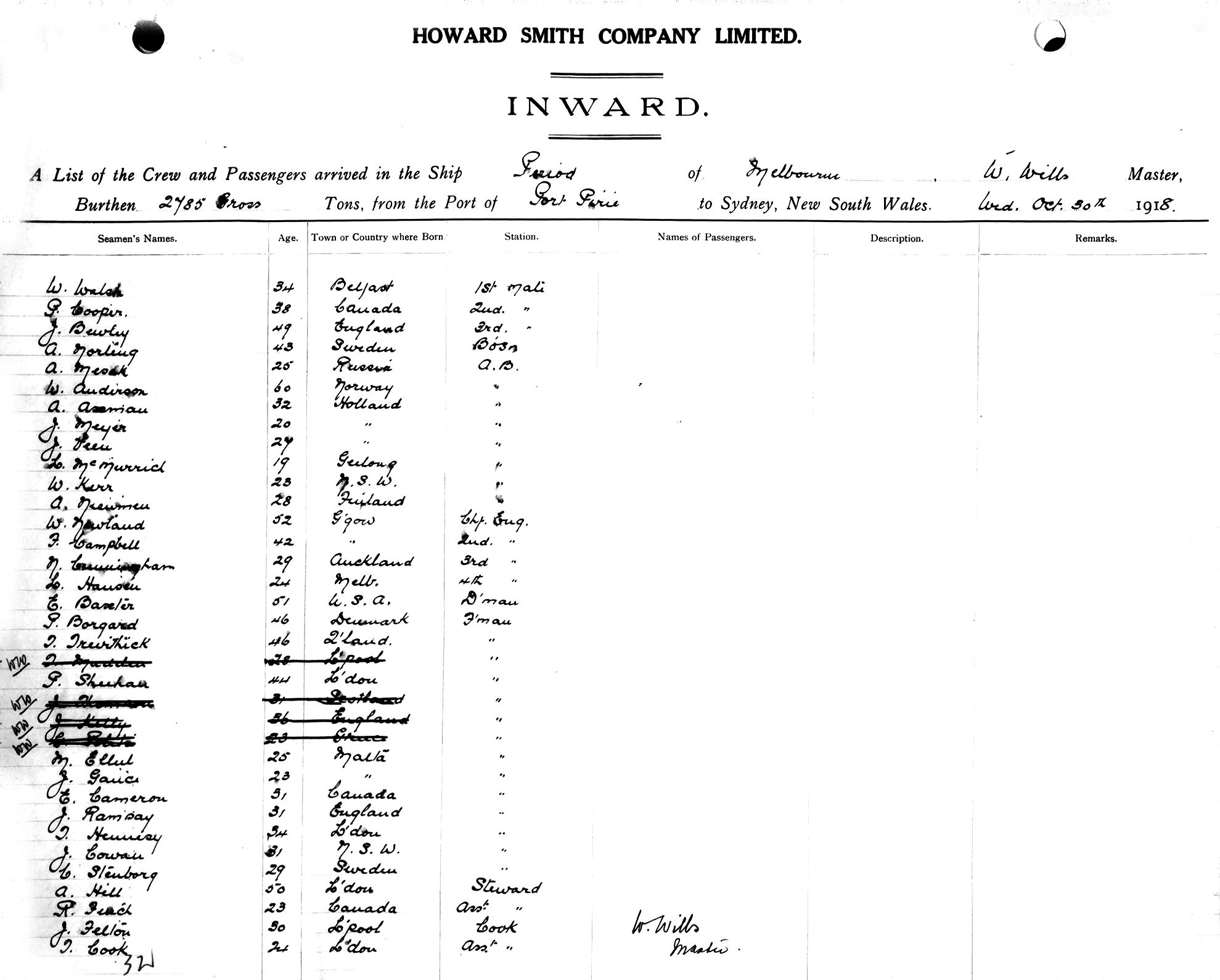 PERIODOF MELBOURNE, W. WILLS, MASTER, BURTHEN 2785 TONS FROM THE PORT OF PORT PIRIE TO SYDNEY, NEW SOUTH WALES, 30TH OCTOBER 1918 |