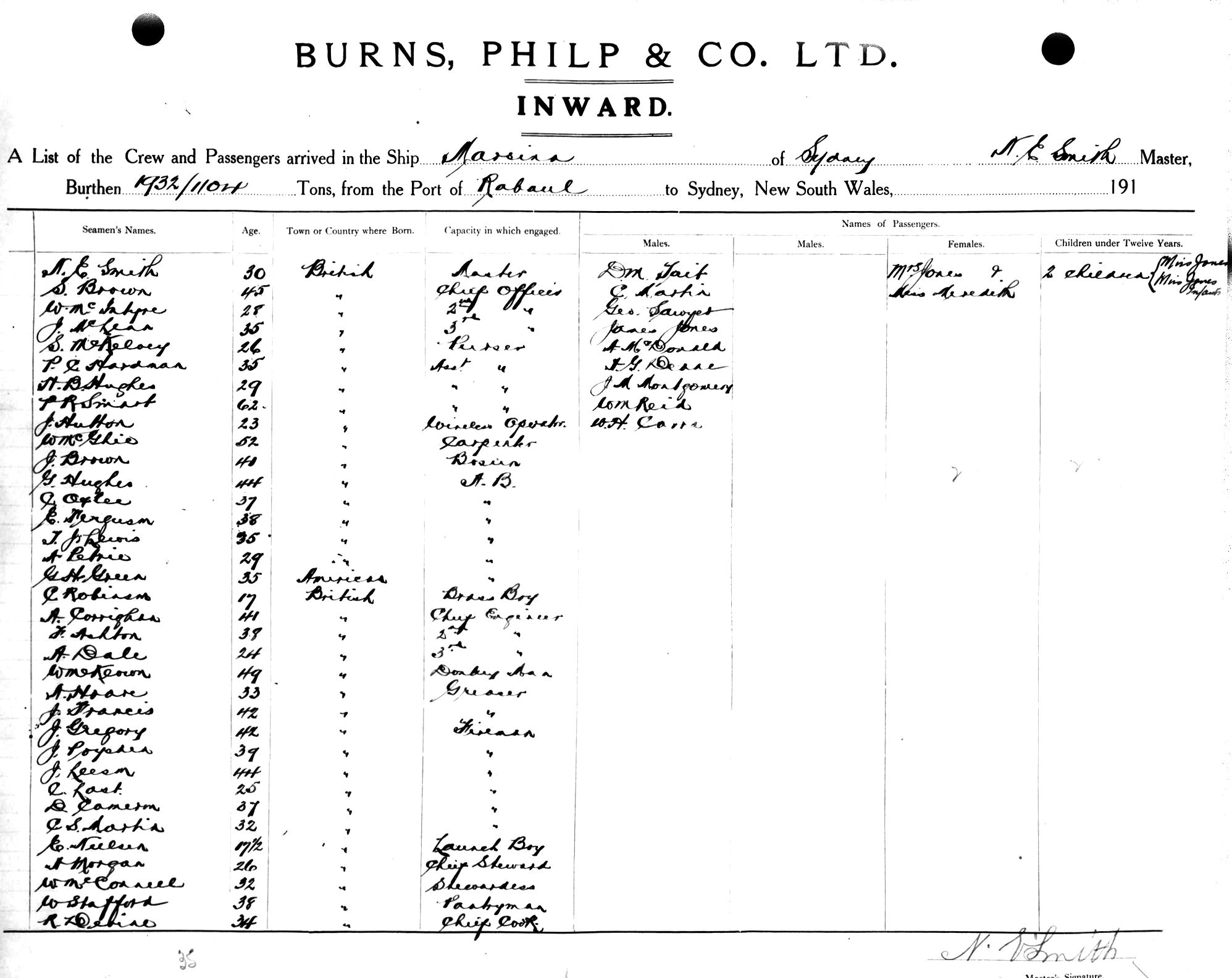 MARSINAOF SYDNEY, N. E. SMITH, MASTER, BURTHEN 1932/1104 TONS FROM THE PORT OF RABAUL TO SYDNEY, NEW SOUTH WALES, 3RD JANUARY 1900