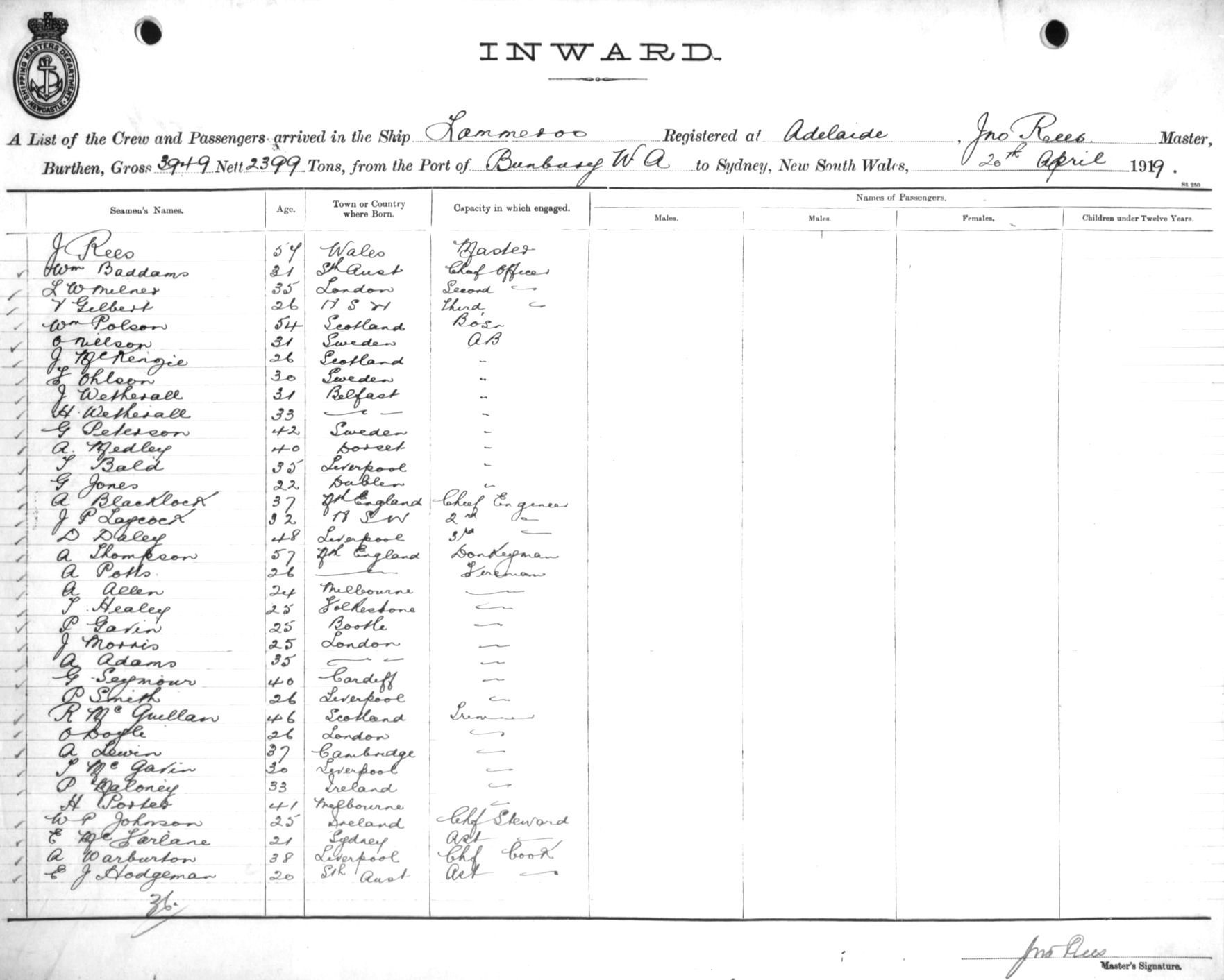 LAMMEROOOF ADELAIDE, JNO. REES, MASTER, BURTHEN 3949/2399 TONS, FROM THE PORT OF BUNBURY, W.A. TO SYDNEY, NEW SOUTH WALES, 20TH APRIL 1919 |